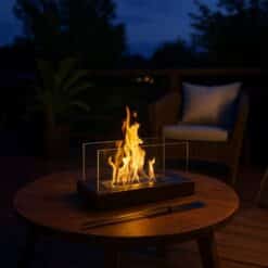 - Przyjemne ciepło i nastrojowa atmosfera – bio kominek nie tylko dekoruje wnętrze, ale też emituje przyjemne ciepło, idealne na chłodne wieczory na tarasie czy w salonie.