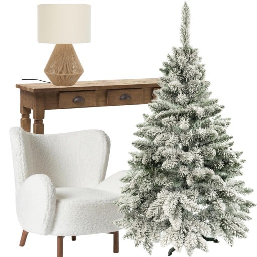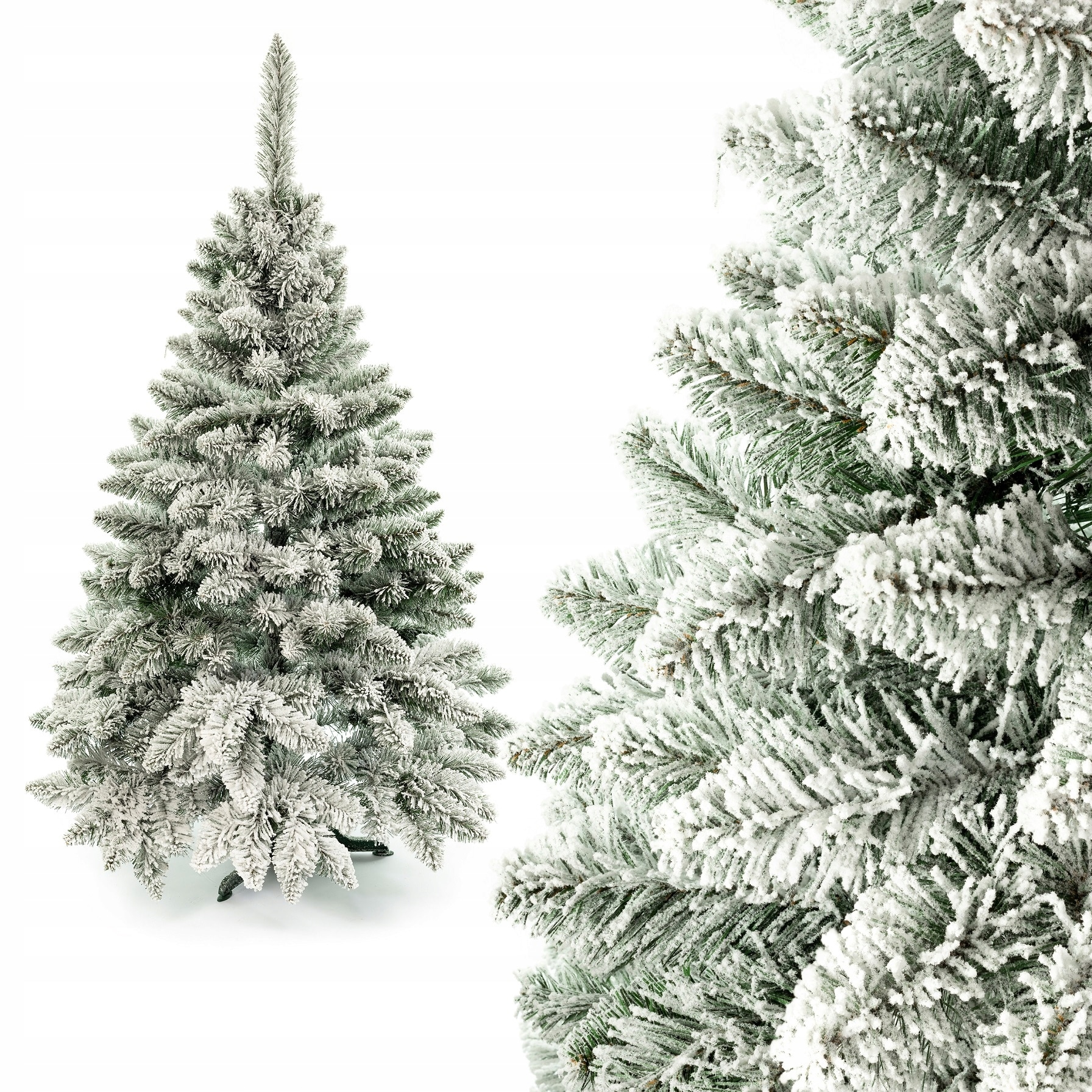 Choinka pokryta sztucznym śniegiem prezentuje się niezwykle urokliwie i wprowadza magiczny klimat. Jej gałęzie są delikatnie oblepione białym, puszystym śniegiem, który sprawia wrażenie świeżo opadającej warstwy z zimowej burzy. Sztuczny śnieg odbija światło, dodając drzewku blasku i subtelnego blasku. Na zielonych igłach choinki śnieg tworzy kontrast, podkreślając ich intensywny, ciemny kolor.