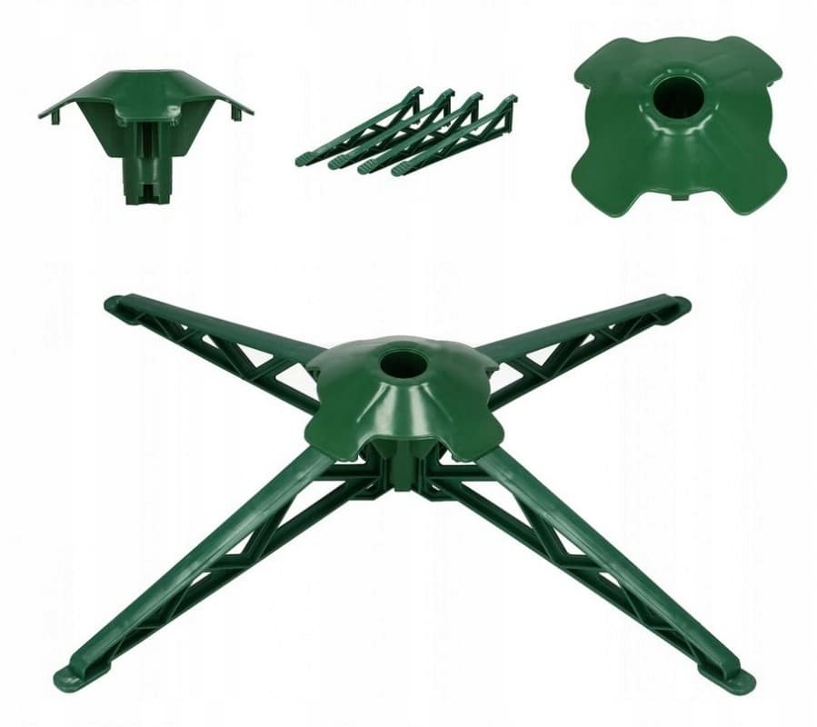 - Montaż stojaka: jest to prosty proces. Wystarczy nałożyć okrągły element na końcówkę choinki i wsunąć nóżki.