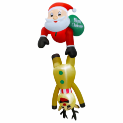 Kreatywny design „do góry nogami” – Mikołaj mocno trzyma renifera, tworząc zabawną i dynamiczną scenę.
