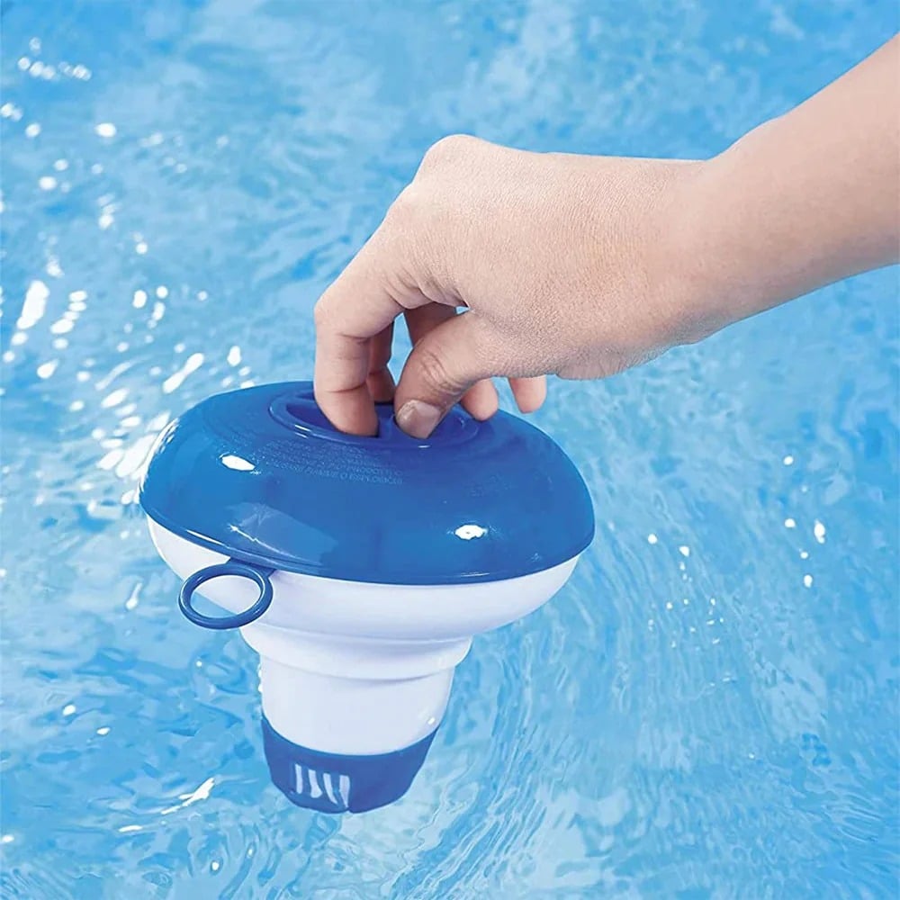 Do dozownika należy włożyć odpowiednią chemię basenową i położyć go na wodzie. Dozownik jest przystosowany do korzystania zarówno z tabletek jak i chemii basenowej w postaci proszku.