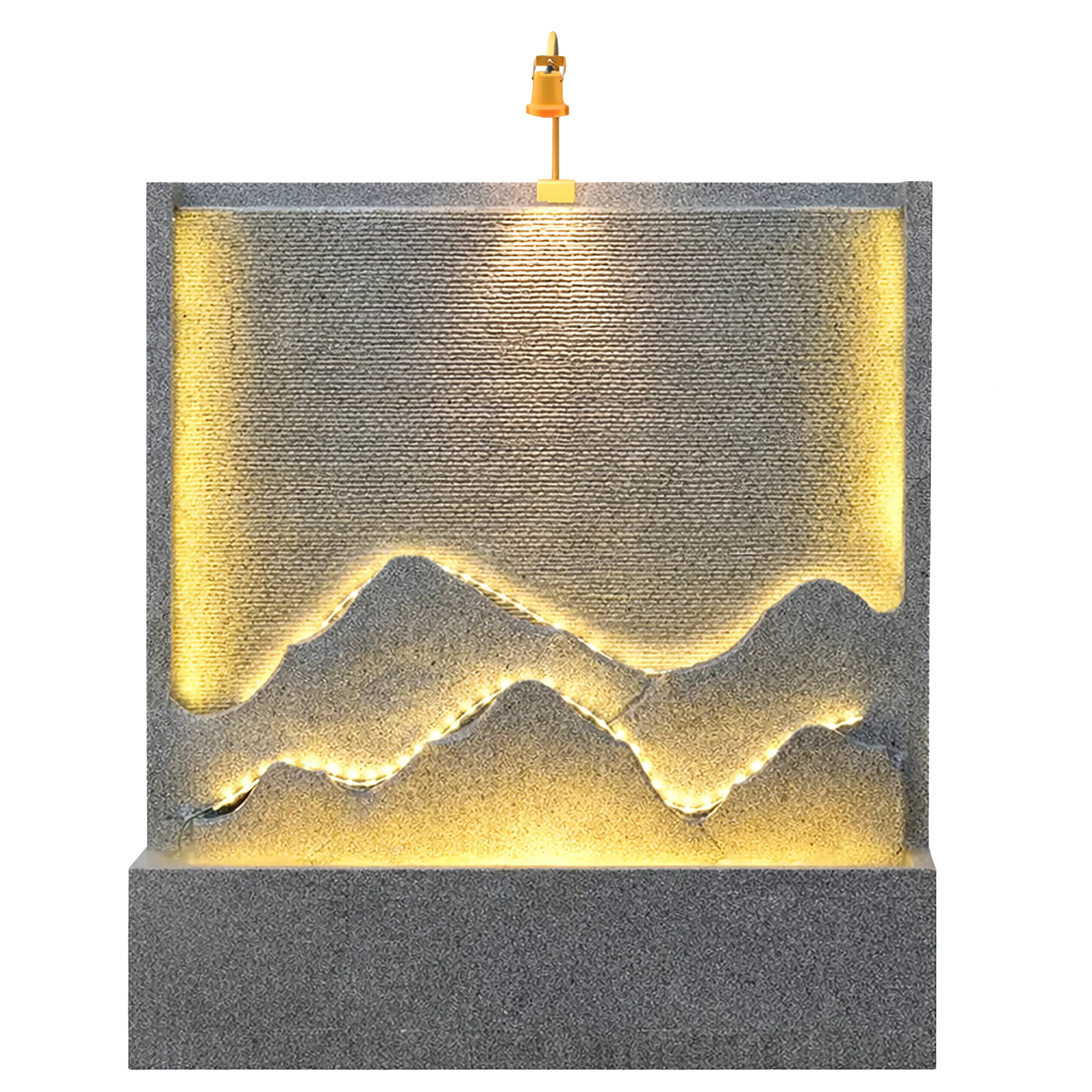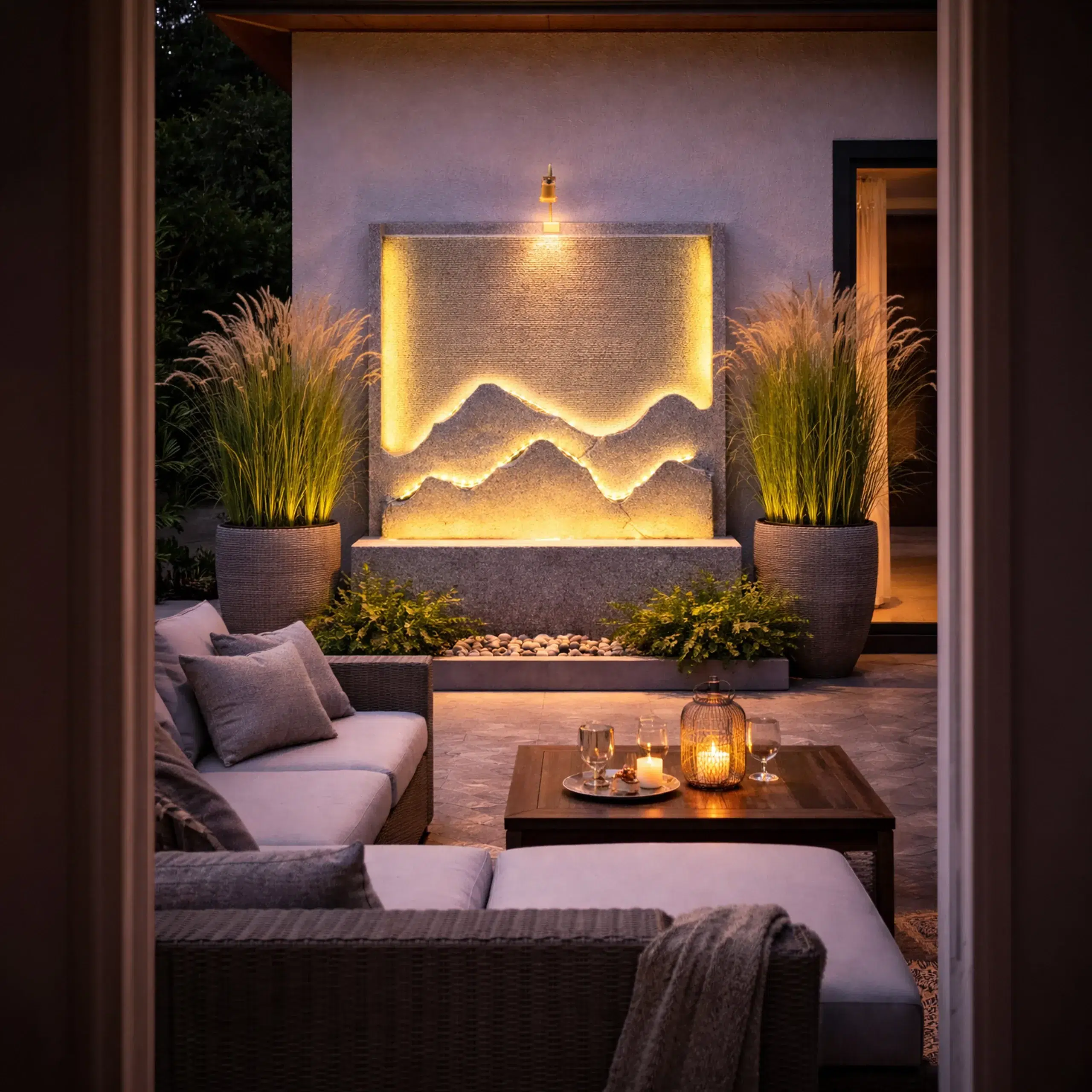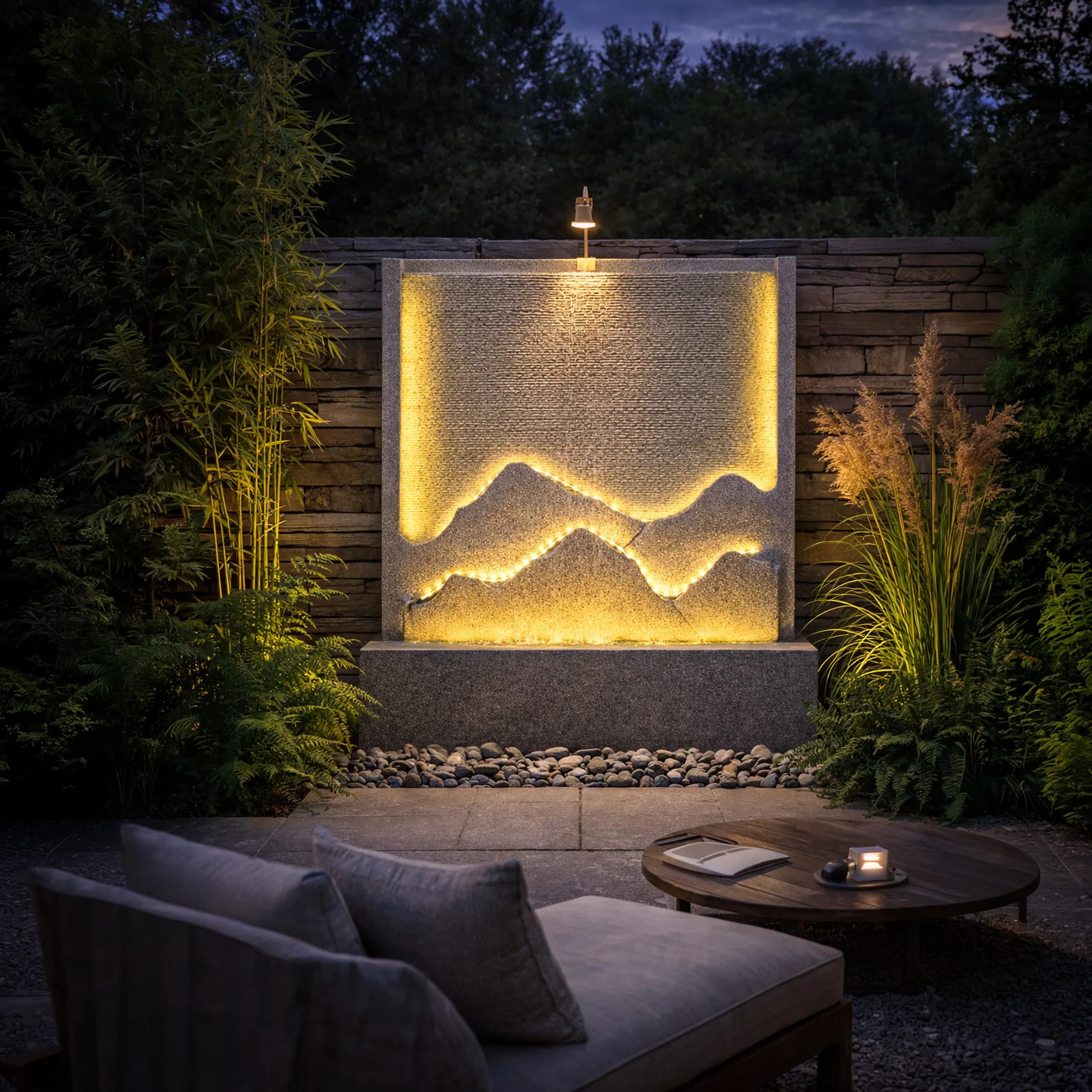 - Podświetlenie LED – subtelne oświetlenie podkreśla strukturę fontanny i efekt wody po zmroku.