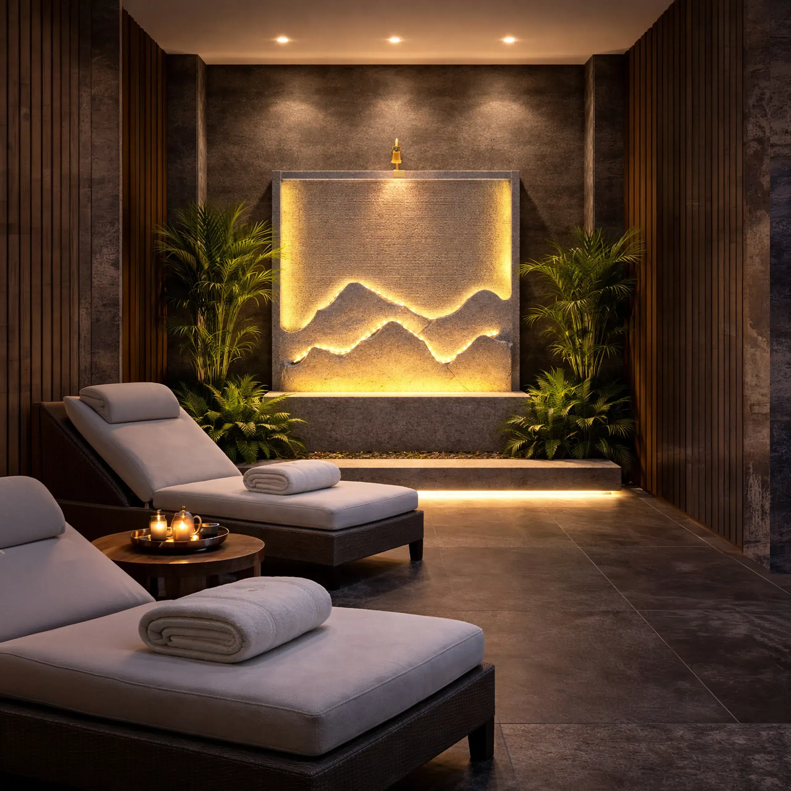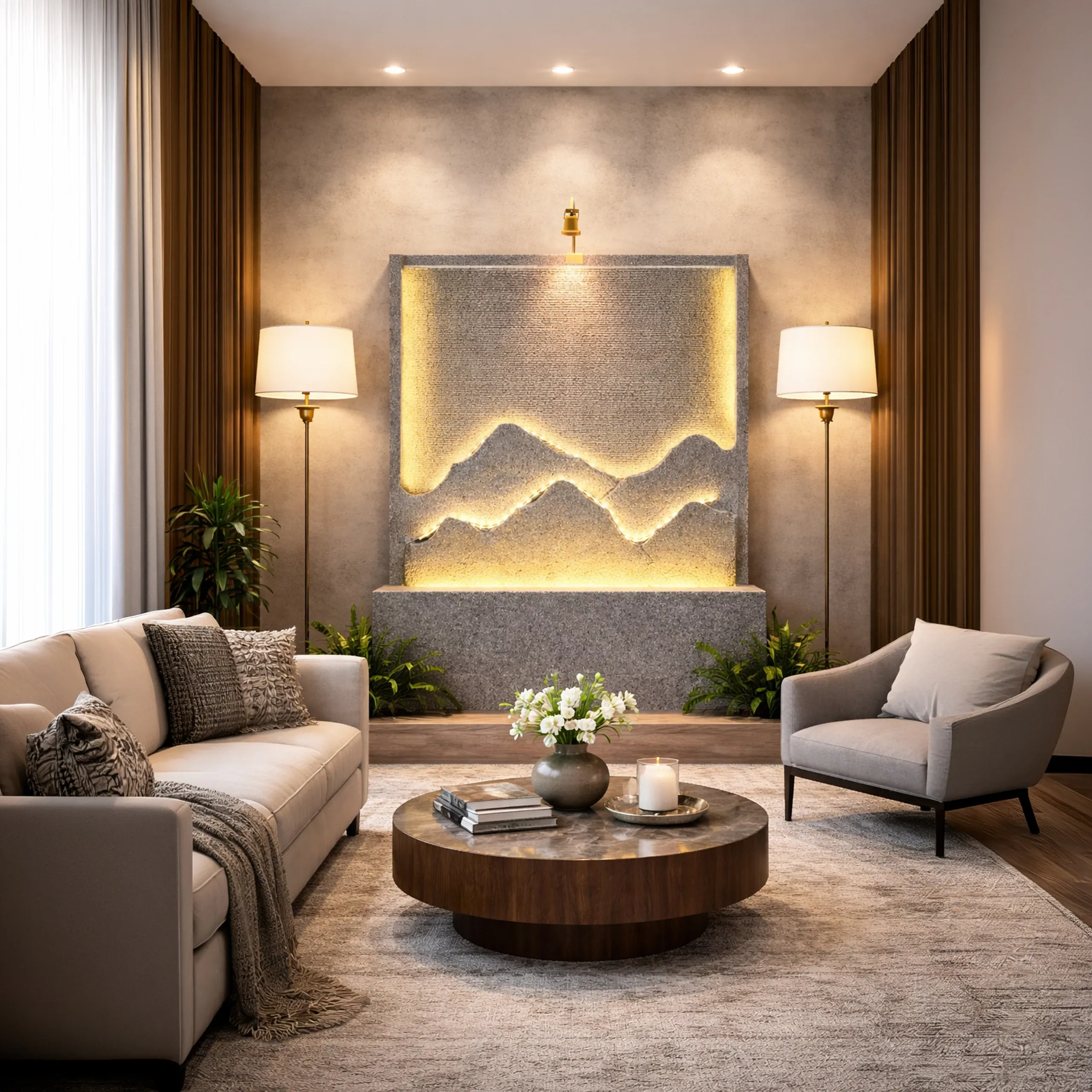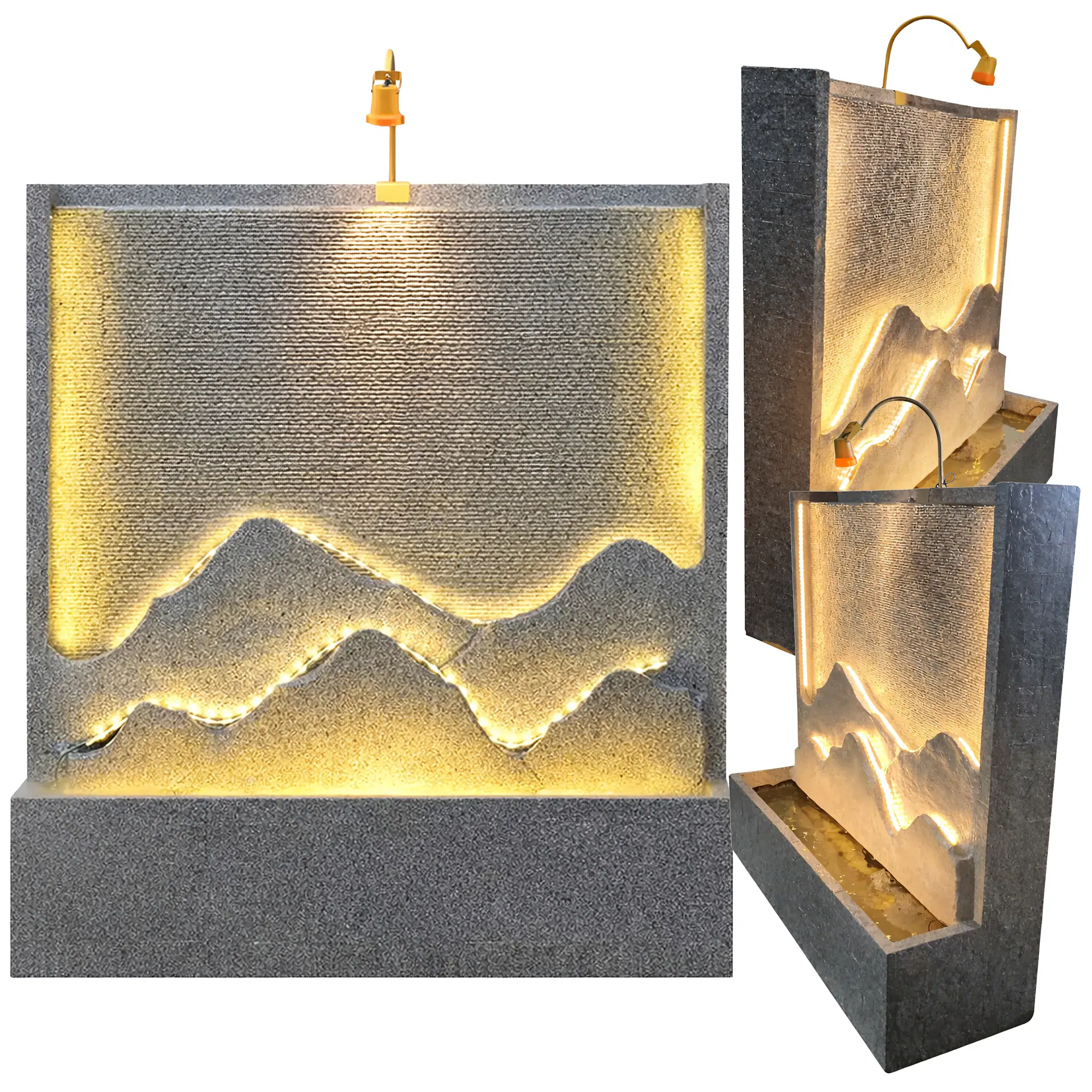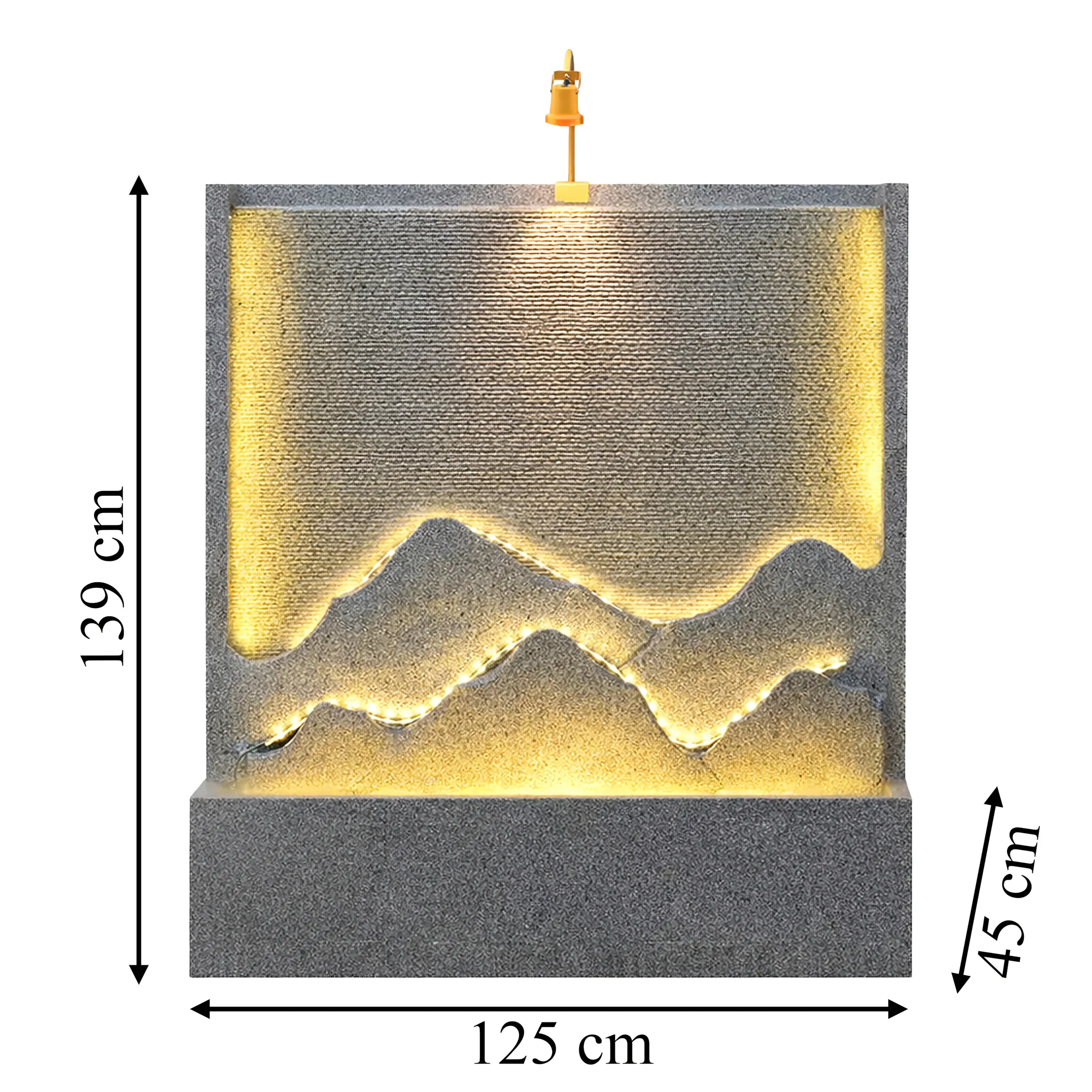 - Podświetlenie LED – subtelne oświetlenie podkreśla strukturę fontanny i efekt wody po zmroku.