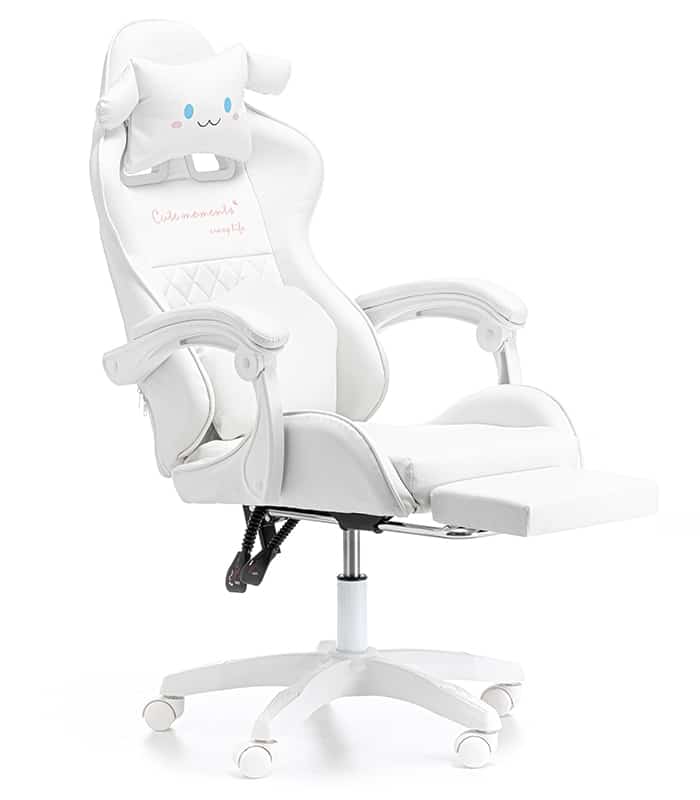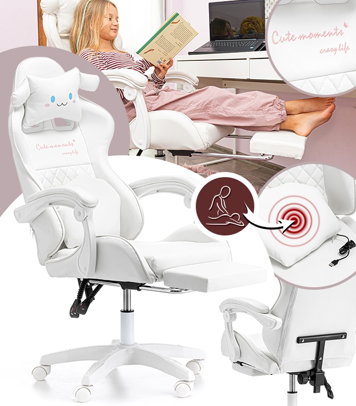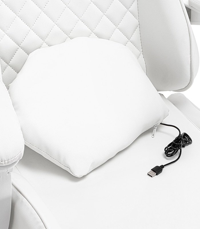 Ten fotel gamingowy został zaprojektowany z myślą o najmłodszych wielbicielach gier komputerowych oraz tych dzieci, które spędzają długie godziny przy biurku. Kubełkowy kształt siedziska zapewni odpowiednią pozycję ciała, która jest bardzo ważna przy rosnących pociechach. Dwie urocze, regulowane poduszki mają za zadanie wspierać odcinek lędźwiowy, szyjny oraz dawać jeszcze większy komfort użytkowania. Chmurka ma wbudowany masażer, który rozluźni spięte mięśnie po całym dniu nauki i zabawy.