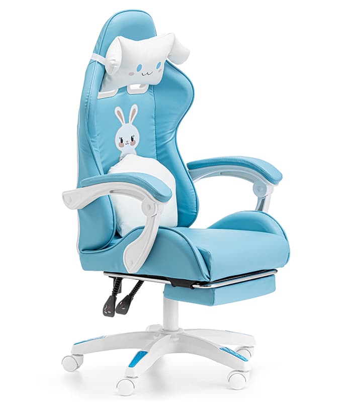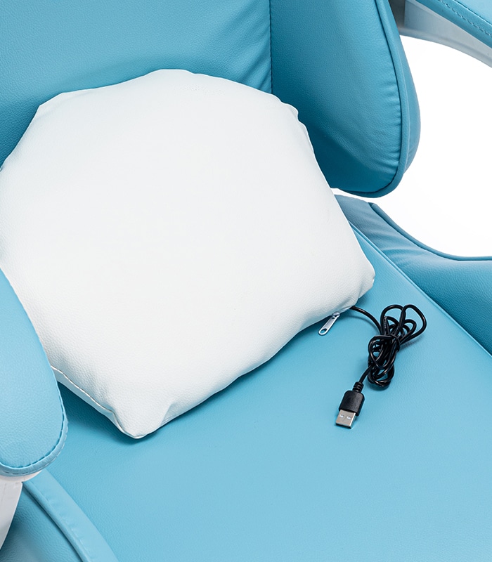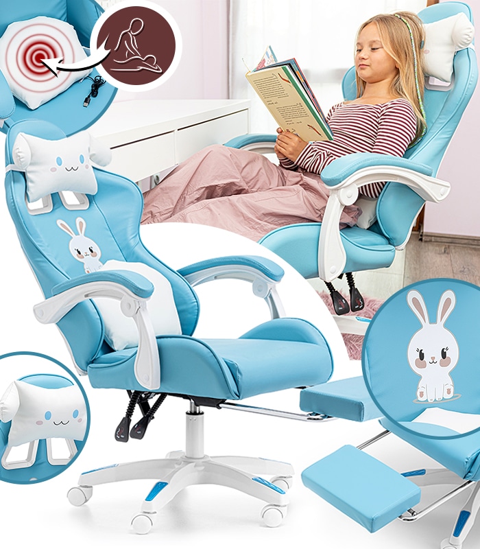Ten fotel gamingowy został zaprojektowany z myślą o najmłodszych wielbicielach gier komputerowych oraz tych dzieci, które spędzają długie godziny przy biurku. Kubełkowy kształt siedziska zapewni odpowiednią pozycję ciała, która jest bardzo ważna przy rosnących pociechach. Dwie urocze, regulowane poduszki mają za zadanie wspierać odcinek lędźwiowy, szyjny oraz dawać jeszcze większy komfort użytkowania. Chmurka ma wbudowany masażer, który rozluźni spięte mięśnie po całym dniu nauki i zabawy.