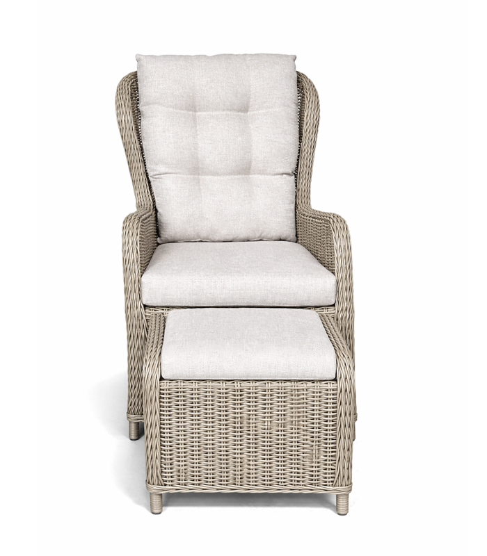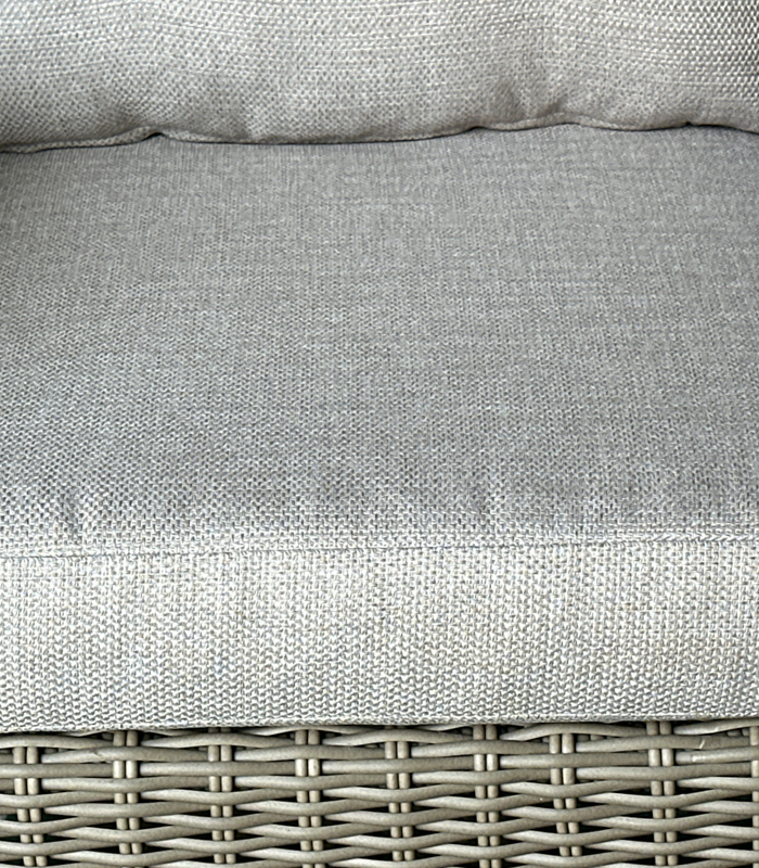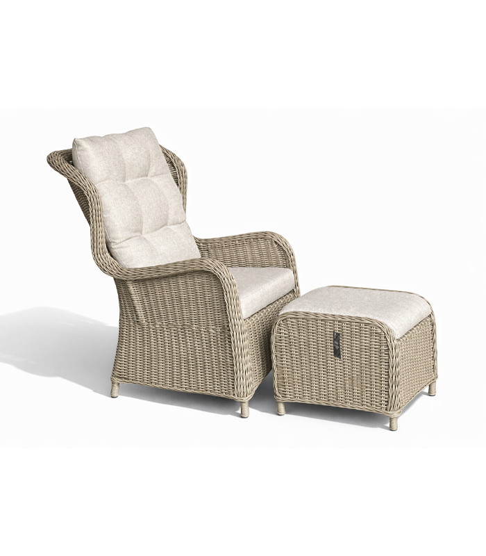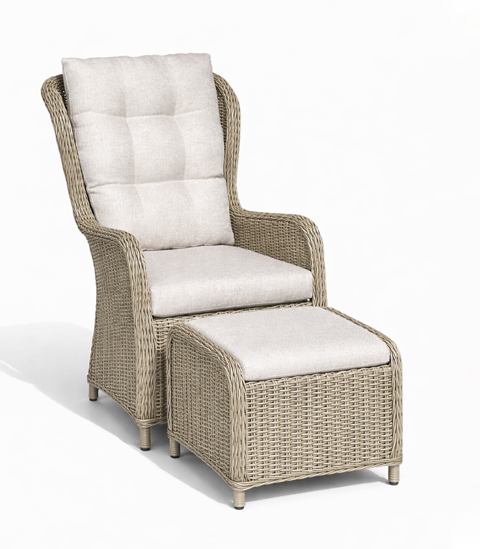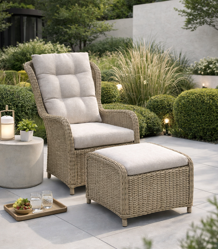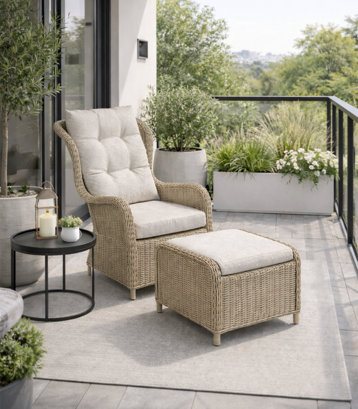 Zestaw wyróżnia się ponadczasową estetyką inspirowaną naturalnym rattanem. Jasna, stonowana kolorystyka w połączeniu z subtelną fakturą plecionki sprawia, że mebel doskonale wpisuje się zarówno w nowoczesne, jak i klasyczne aranżacje. Elegancki wygląd sprawia, że fotel z podnóżkiem stanie się stylowym akcentem każdego ogrodu, balkonu czy salonu.