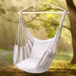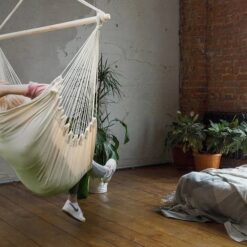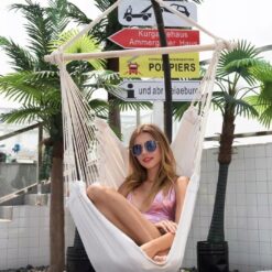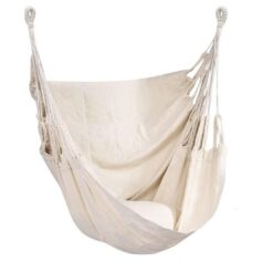 Od dziś możesz mieć swoje wyjątkowe miejsce w salonie, na tarasie czy w ogrodzie. Nasze krzesło brazylijskie przeniesie Cię w świat relaksu i błogiego odpoczynku. Hamak dostępny jest w uniwersalnej kolorystyce, która będzie pasować do każdego otoczenia. W komplecie otrzymasz dwie wygodne poduszki, które możesz dowolnie ułożyć, aby poprawić komfort swojego wypoczynku. Produkt jest z wytrzymałego, naturalnego materiału, który zapewnia dobrą wentylację. Hamak może być zawieszony na haku bądź pałąku, wedle uznania.
