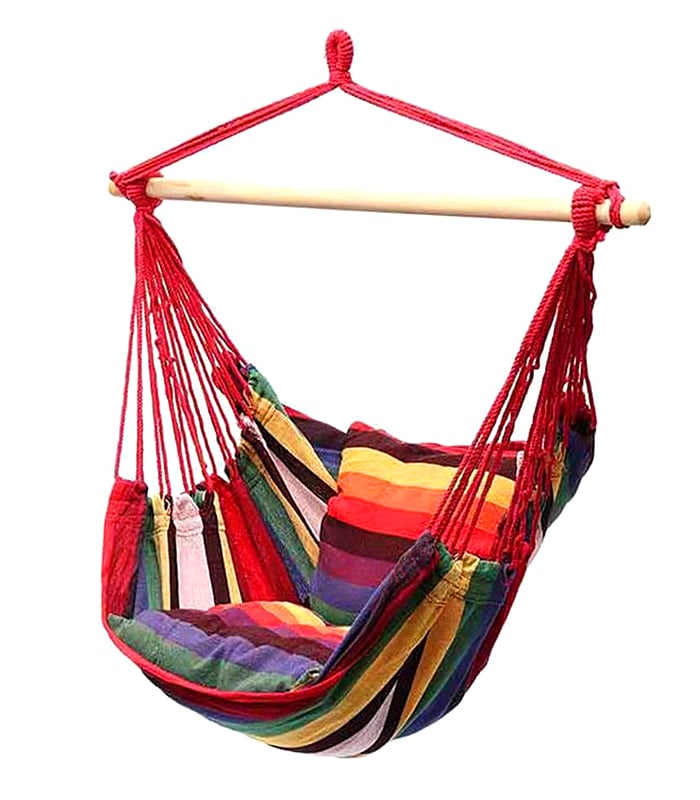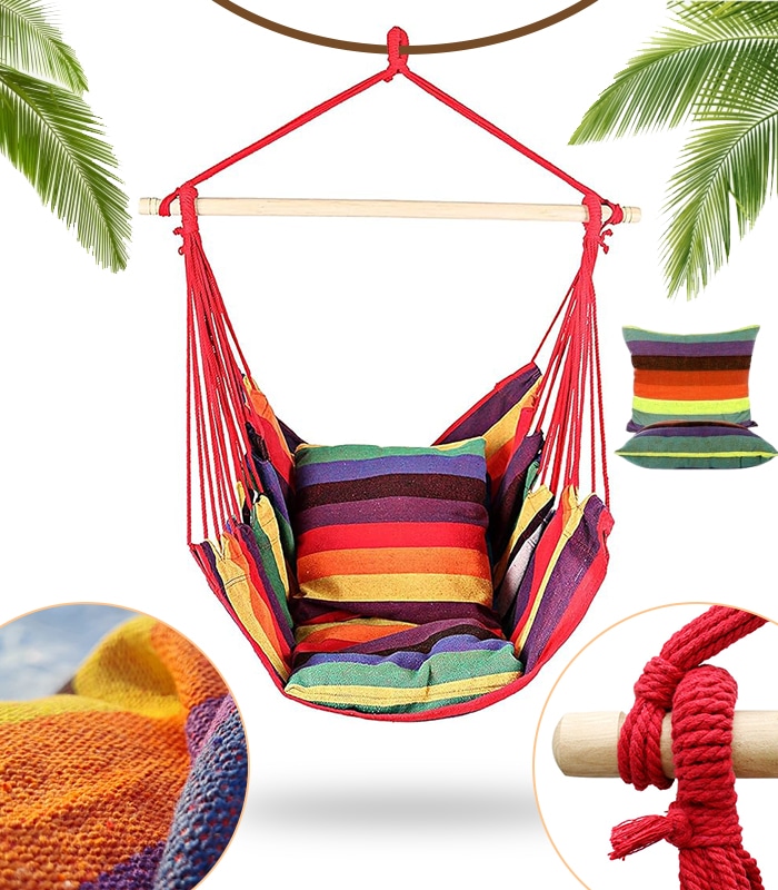 Od dziś możesz mieć swoje wyjątkowe miejsce w salonie, na tarasie czy w ogrodzie. Nasze krzesło brazylijskie przeniesie Cię w świat relaksu i błogiego odpoczynku. Hamak dostępny jest w uniwersalnej kolorystyce, która będzie pasować do każdego otoczenia. W komplecie otrzymasz dwie wygodne poduszki, które możesz dowolnie ułożyć, aby poprawić komfort swojego wypoczynku. Produkt jest z wytrzymałego, naturalnego materiału, który zapewnia dobrą wentylację. Hamak może być zawieszony na haku bądź pałąku, wedle uznania.