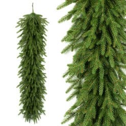 Girlanda to dekoracyjny element wykonany z gałązek syntetycznych, które imitują naturalne gałęzie, ale są bardziej trwałe i odporne na warunki atmosferyczne. Gałązki wykonane z materiału PE (polietylen) mają trójwymiarową strukturę, co nadaje girlandzie realistyczny wygląd i głębię