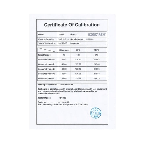 - Każdy klucz ma indywidualny certyfikat kalibracji i numer seryjny – kalibrowany i testowany klucz dynamometryczny działa dokładnie, możesz być pewny, że dokręci śruby z ustawioną siłą.