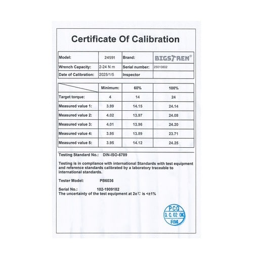 - Każdy klucz ma indywidualny certyfikat kalibracji i numer seryjny – kalibrowany i testowany klucz dynamometryczny działa dokładnie, możesz być pewny, że dokręci śruby z ustawioną siłą.
