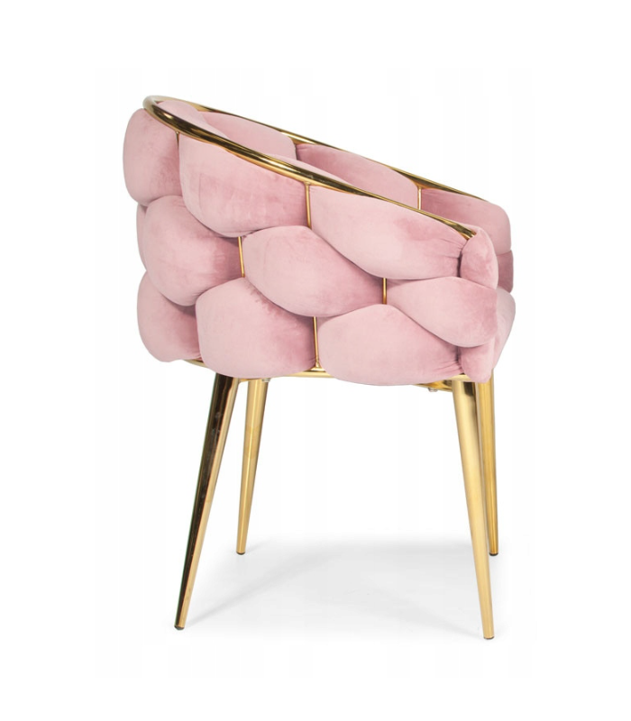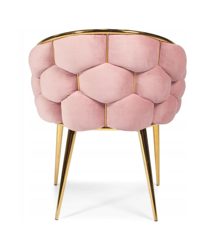 Solidna podstawa wykonana ze stali w złotym kolorze zapewnia stabilność i trwałość na lata. Welurowa tapicerka jest miękka i przyjemna w dotyku, a odpowiednio wyprofilowane siedzisko zwiększa komfort codziennego użytkowania. Model świetnie sprawdzi się przy stole w jadalni, przy biurku, w domowym gabinecie lub jako efektowne krzesło pomocnicze w salonie czy sypialni.