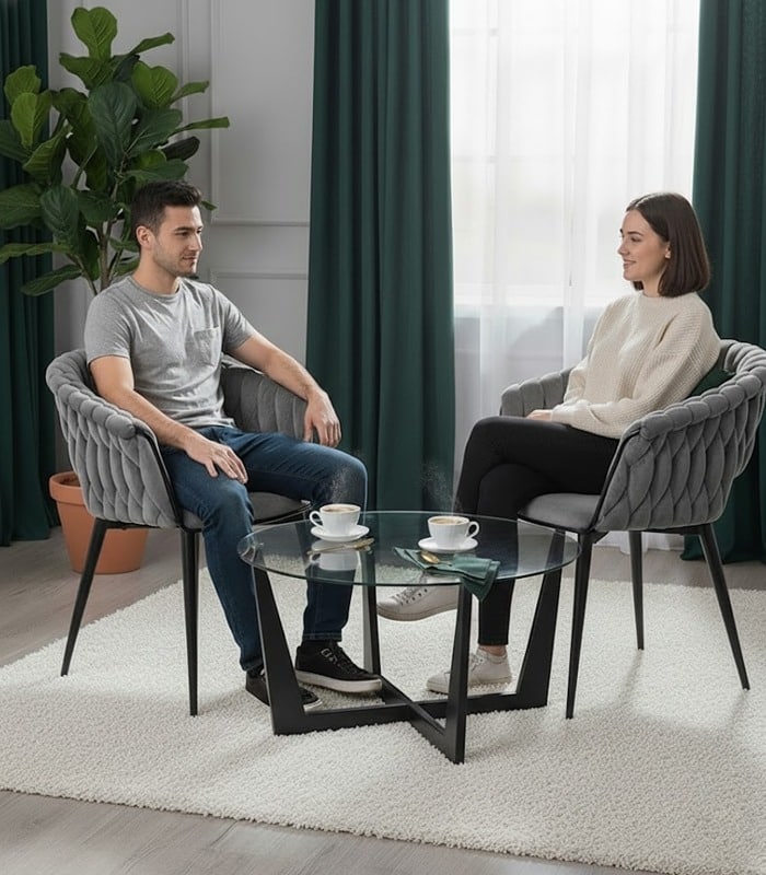 Szerokie, miękkie siedzisko oraz ergonomicznie wyprofilowane oparcie gwarantują pełen komfort nawet podczas dłuższego siedzenia. Dodatkowe podłokietniki zapewniają stabilne podparcie dla rąk, zwiększając wygodę użytkowania. To idealne krzesło do relaksu przy kawie, pracy przy biurku lub długich rozmów z bliskimi przy stole.