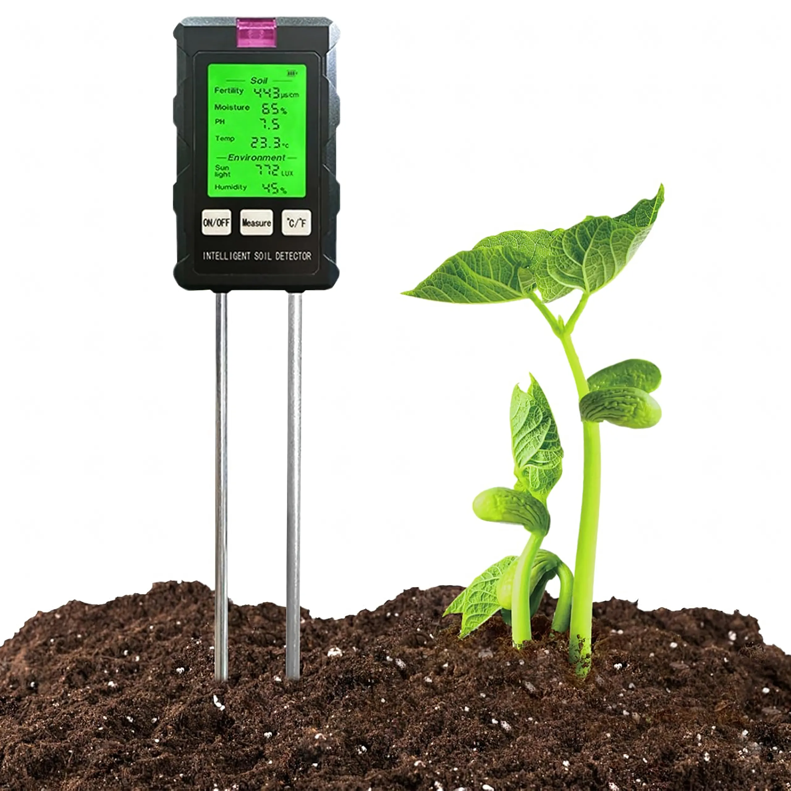 - Zakres pomiarów: pH, wilgotność gleby, temperatura gleby, żyzność, światło, wilgotność otoczenia