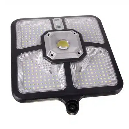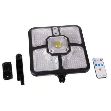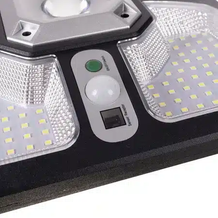 Pilot + 4 tryby pracy – wygodne sterowanie lampą odbywa się przy pomocy pilota. Posiada on przyciski Off i On oraz 3 tryby przełączania. ON- Włącz – OFF – Wyłącz MODE 1 – Tryb 1: Po wykryciu ruchu, lampa świeci 100% mocy maksymalnej przez 30 sekund. MODE 2 – Tryb 2: Po wykryciu ruchu, lampa świeci 30% mocy maksymalnej przez 30 sekund. MODE 3 – Tryb 3: Po wykryciu ruchu, lampa świeci 50% mocy maksymalnej przez 30 sekund. SOS – przycisk SOS wyłącza czujnik ruchu i czujnik zmierzchu , lampa świeci na stałe do rozładowania akumulatora na ok 50- 70% mocy.