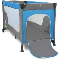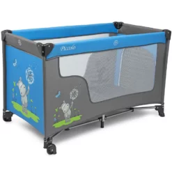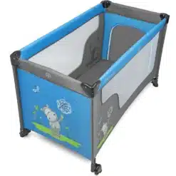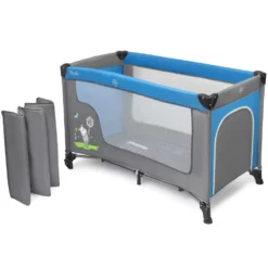 Łóżeczko turystyczne dla dzieci w kolorze szarym z niebieskimi akcentami. Łóżeczko łatwo rozłożyć i złożyć za pomocą tylko kilku ruchów. Przenoszenie jest ułatwione dzięki kółkom z blokadą. Po złożeniu łóżeczko można schować do pokrowca z uchwytem.