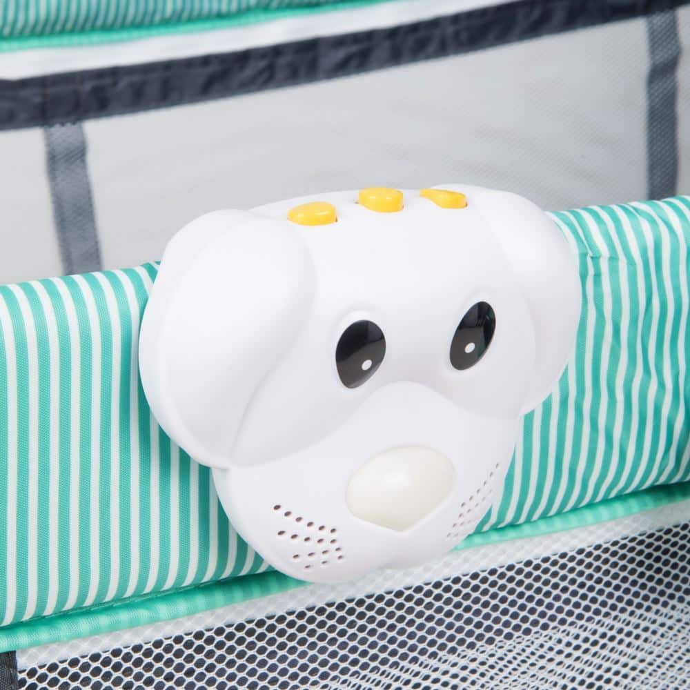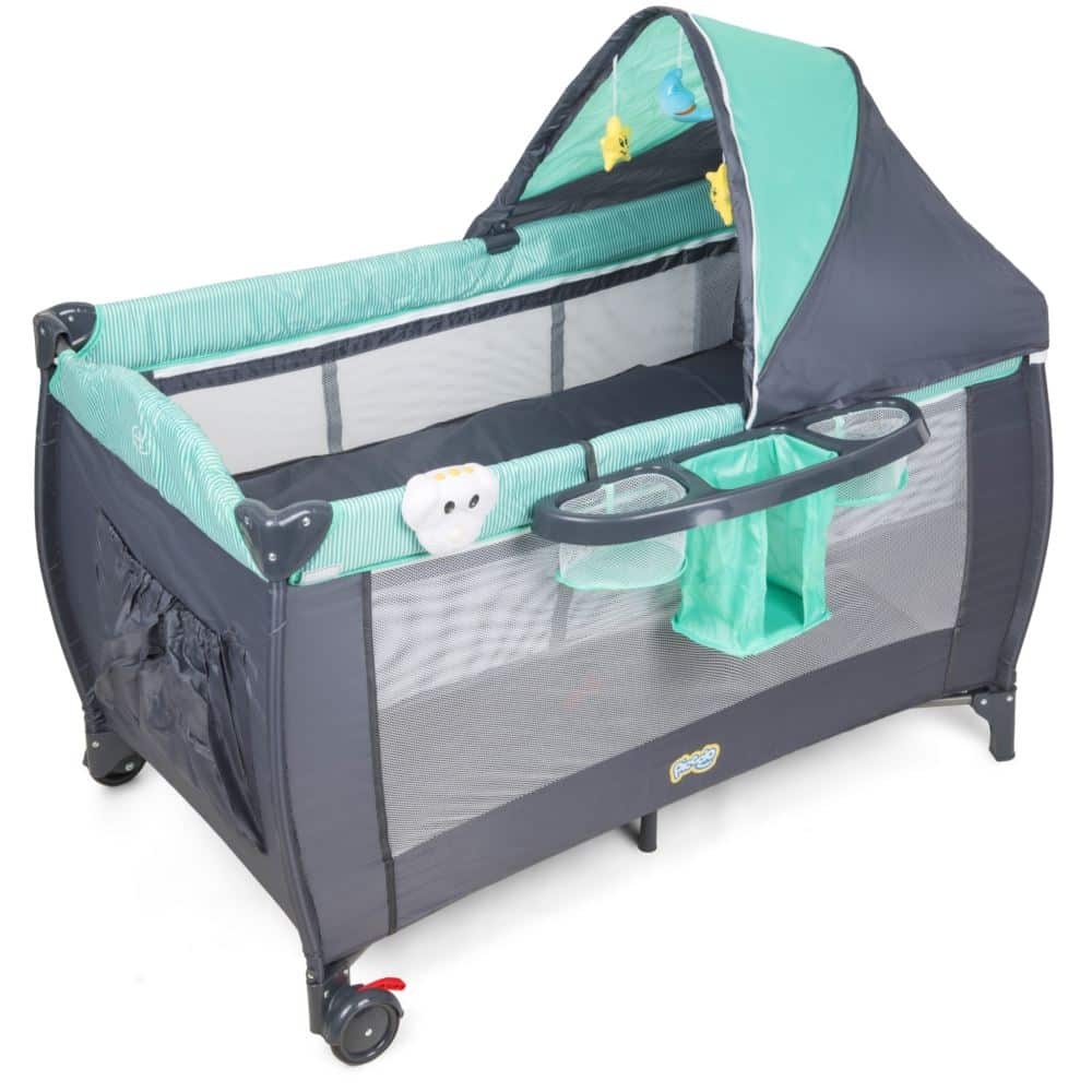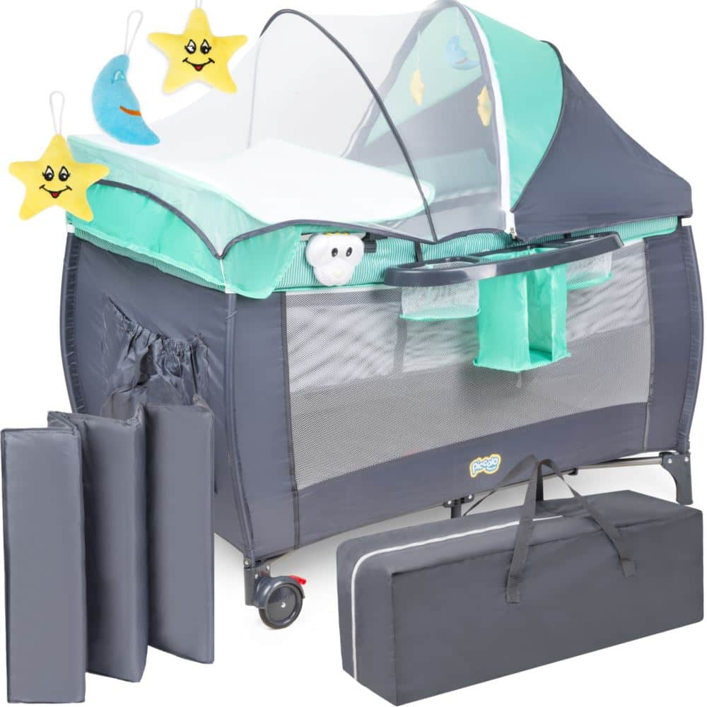 Łóżeczko turystyczne składane z bogatym zestawem dodatków oraz regulacją wysokości
