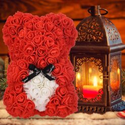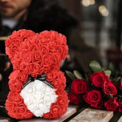 Miś z róż 25cm czerwony z białym serduszkiem