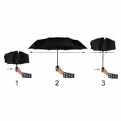 Praktyczny parasol automatyczny. Jeden przycisk służy do rozkładania i składania kapelusza parasola. Dzięki niewielkim rozmiarom po złożeniu mieści się w torebce czy nawet w większej kieszeni. Końcówki ramion parasola wykonane są z włókna węglowego, dzięki czemu posiada dużą odporność na podmuchy wiatru. Parasol zapinany jest na rzep i posiada elegancki pokrowiec ochronny.