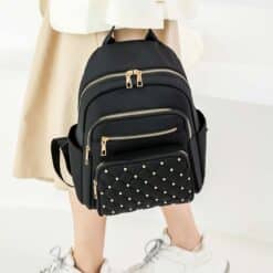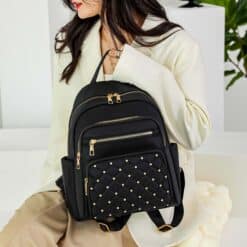 Czarny plecak ze złotymi elementami to nie tylko praktyczność, ale także ponadczasowa elegancja. To właśnie wysmakowane detale sprawiają, że nasz produkt doskonale uzupełnia każdą stylizację. Dzięki temu kobiecy plecak staje się idealnym towarzyszem zarówno na formalne okazje, jak i na codzienne wyjścia, zapewniając zarówno wygodę, jak i stylową prezencję.