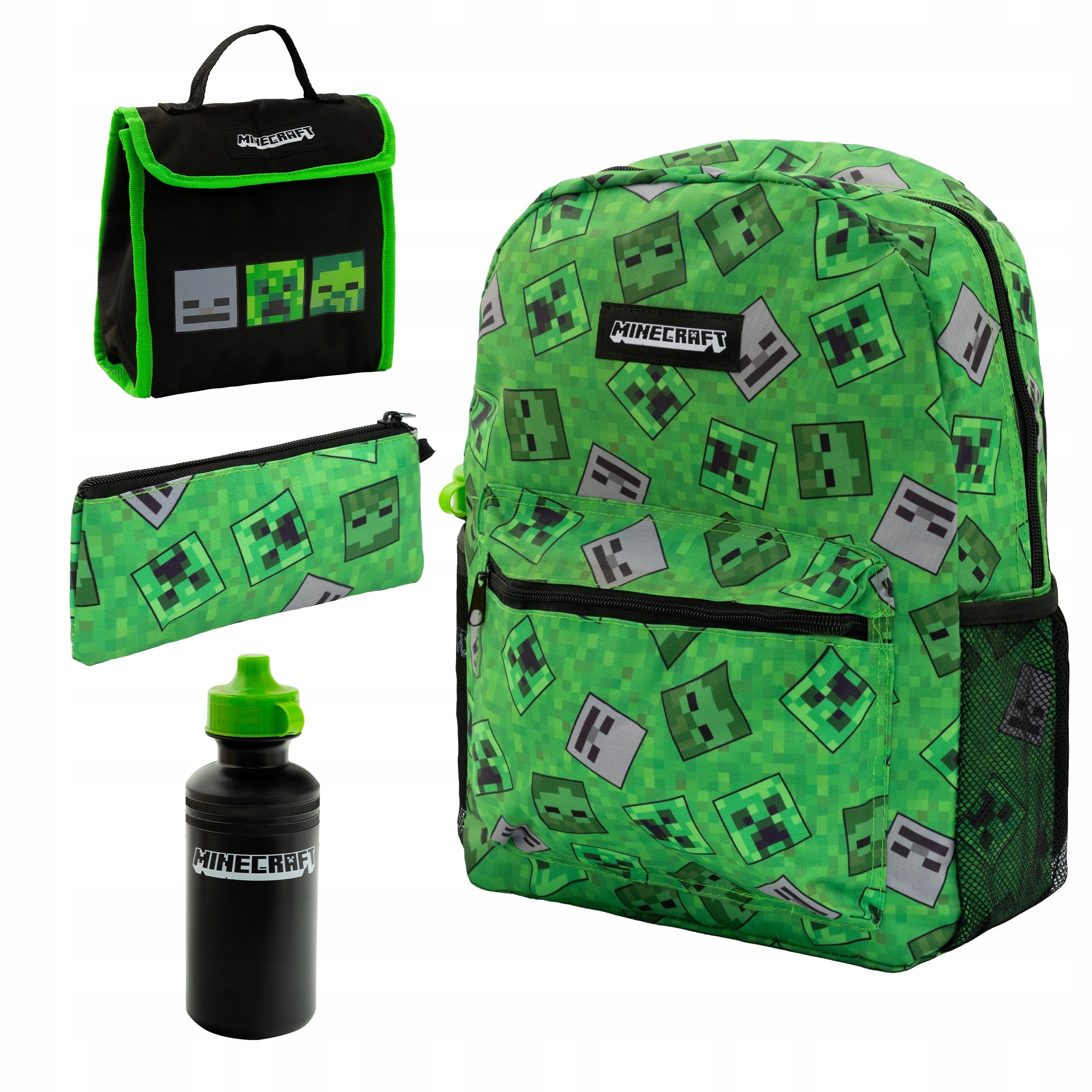 Niesamowity zestaw Minecraft składający się z jednokomorowego plecaka, torby śniadaniowej, bidonu i piórnika. Wejdź do świata swojej ulubionej gry dzięki niezwykłemu pikselowemu motywowi najpopularniejszych bohaterów Minecrafta! Zielony jednokomorowy plecak i piórnik z awatarami m.in. Creepera pomieszczą niezbędne przedmioty każdego ucznia. Pojemna torba śniadaniowa pomieści pyszne kanapki i smakołyki. Natomiast czarny bidon z logo Minecraft schowasz w jednej z dwóch bocznych kieszonek plecaka. Ten Zestaw został stworzony dla Ciebie!