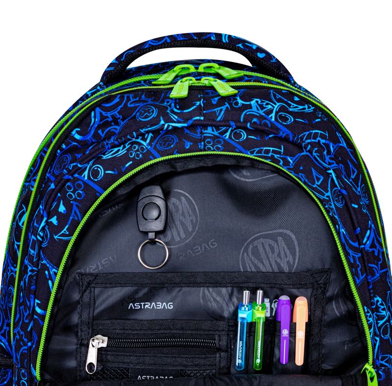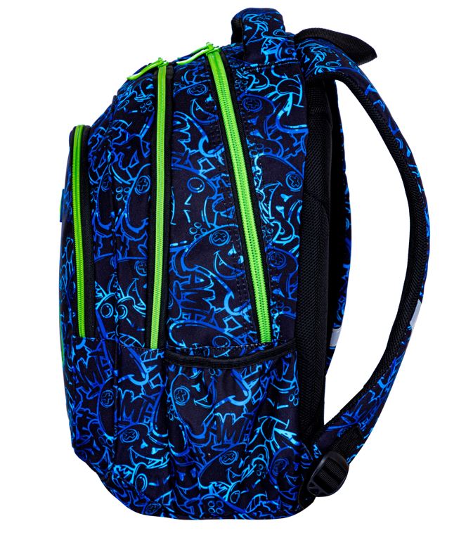 Plecak posiada boczne kieszenie na bidon lub butelkę z wodą, co zachęca dziecko do regularnego nawadniania się. Dodatkowe przegródki pozwalają na uporządkowanie długopisów, kredek i innych drobiazgów. Wygodny uchwyt na górze ułatwia zawieszenie plecaka w szkole lub przenoszenie go w ręku.