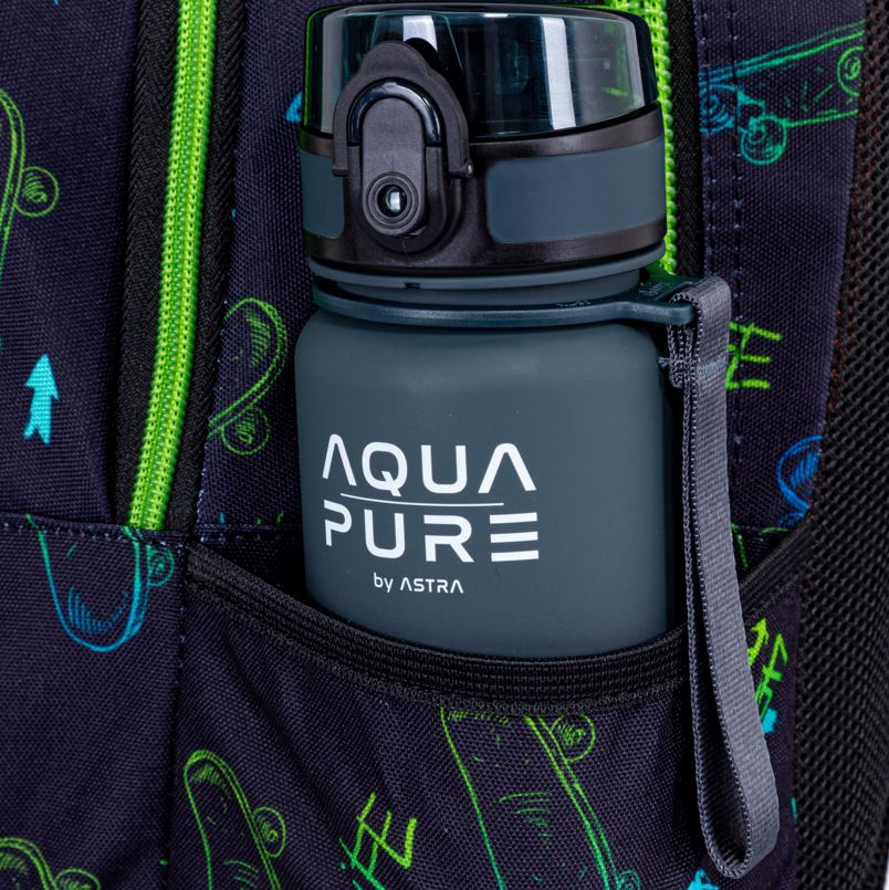 Plecak posiada boczne kieszenie na bidon lub butelkę z wodą, co zachęca dziecko do regularnego nawadniania się. Dodatkowe przegródki pozwalają na uporządkowanie długopisów, kredek i innych drobiazgów. Wygodny uchwyt na górze ułatwia zawieszenie plecaka w szkole lub przenoszenie go w ręku.