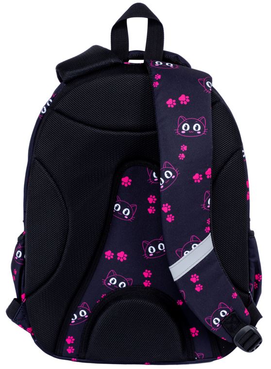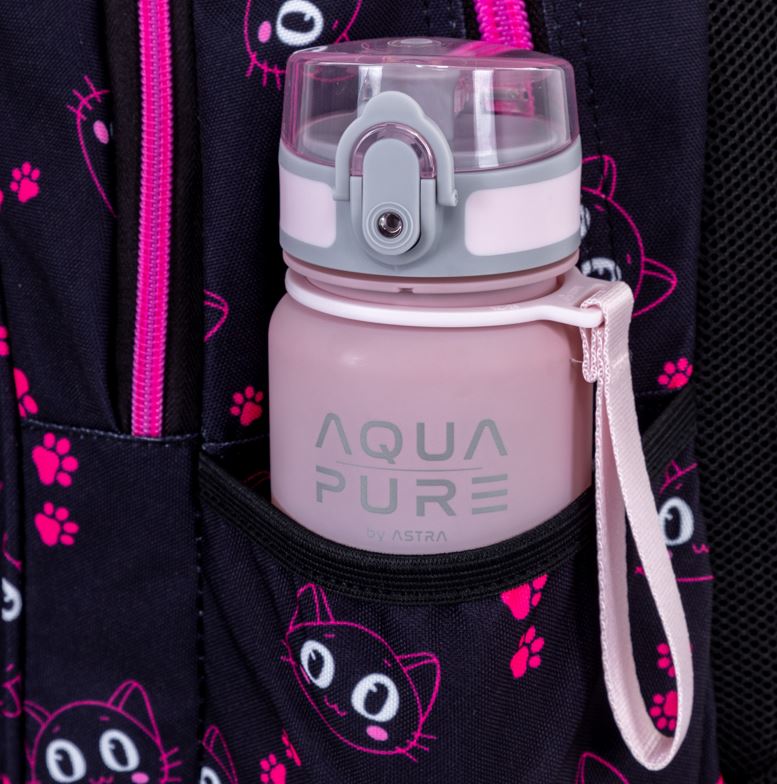 Plecak posiada boczne kieszenie na bidon lub butelkę z wodą, co zachęca dziecko do regularnego nawadniania się. Dodatkowe przegródki pozwalają na uporządkowanie długopisów, kredek i innych drobiazgów. Wygodny uchwyt na górze ułatwia zawieszenie plecaka w szkole lub przenoszenie go w ręku.