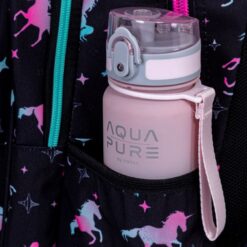 Plecak posiada boczne kieszenie na bidon lub butelkę z wodą, co zachęca dziecko do regularnego nawadniania się. Dodatkowe przegródki pozwalają na uporządkowanie długopisów, kredek i innych drobiazgów. Wygodny uchwyt na górze ułatwia zawieszenie plecaka w szkole lub przenoszenie go w ręku.