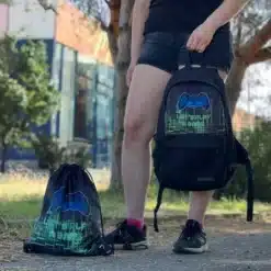 Plecak wchodzący w skład zestawu został wykonany z wytrzymałego materiału OXFORD 600D, który charakteryzuje się wysoką odpornością na uszkodzenia mechaniczne oraz warunki atmosferyczne. Wnętrze plecaka wykończone jest podszewką również wykonaną z tego samego materiału, co stanowi dodatkową ochronę dla książek i zeszytów przed wilgocią. Dodatkowo, między warstwą zewnętrzną a podszewką, na całej powierzchni pleców plecaka znajduje się wypełnienie z pianki EPE, które nie tylko zwiększa komfort użytkowania, ale również dodatkowo chroni zawartość przed wstrząsami i uderzeniami. Plecak jest wyposażony w dwie boczne kieszonki wykonane z siateczki z gumką, które idealnie nadają się do przenoszenia butelki z wodą czy innych drobnych przedmiotów. Plecak ma dużą pojemność – aż 22l.