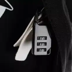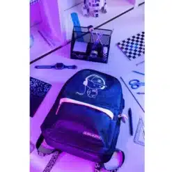 Jest to praktyczny i pakowny model. Na przodzie znajdziemy zasuwaną kieszeń. A po jego bokach dwie kieszonki np. na butelki z napojami. Posiada jedną dużą komorę, zasuwaną podwójnymi mocny suwakami, a w niej 4 mniejsze w tym 1 na zamek. Dodatkowo do plecaka dodajemy piórnik, który sprawdzi się również jako mini kosmetyczka oraz przewody USB i mini jack. W zestawie jest też kłódka na szyfr, która sprawdzi się w szkole czy na wycieczce.
