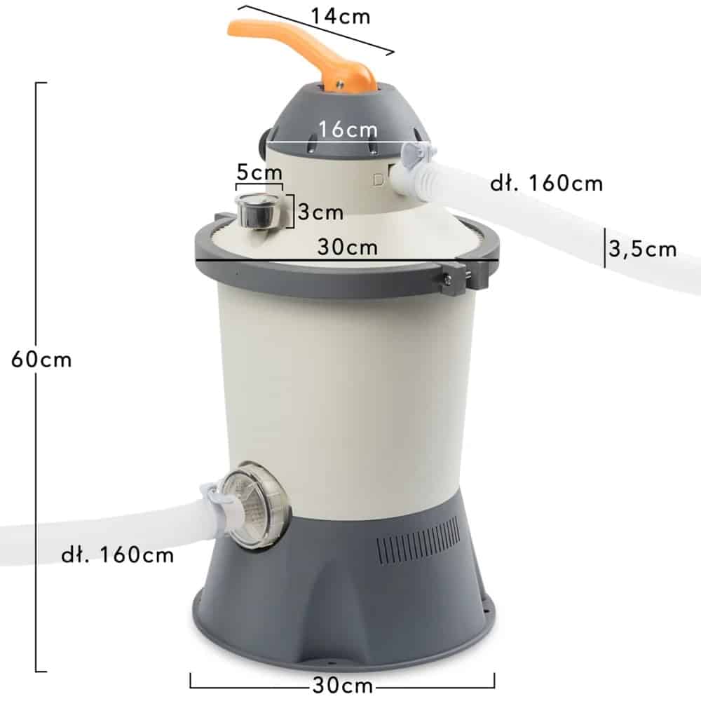 Solidna konstrukcja pompy zapewnia długowieczność i odporność na szereg czynników zewnętrznych. Urządzenie jest wyposażone w filtr piaskowy, który skutecznie usuwa zanieczyszczenia oraz drobiny z wody, gwarantując czystość i bezpieczeństwo podczas użytkowania. Ergonomiczny kształt i intuicyjny zawór sterujący sprawiają, że obsługa pompy jest niezwykle prosta i wygodna. Dzięki nowoczesnej technologii, pompa pracuje cicho, co jest dodatkowym atutem, gdy zależy nam na spokojnym odpoczynku w ogrodzie.