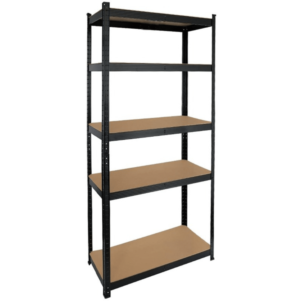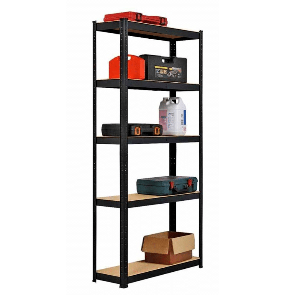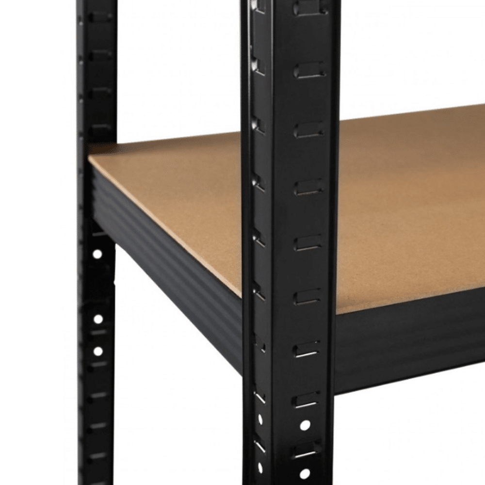 Czarny regał magazynowy o wymiarach 150x70x30 cm to praktyczne i solidne rozwiązanie do przechowywania narzędzi, zapasów czy akcesoriów w domu, warsztacie lub sklepie. Wykonany z trwałej stali malowanej proszkowo i płyt MDF, zapewnia stabilność oraz dużą nośność – aż 875 kg łącznie (175 kg na każdą półkę).
