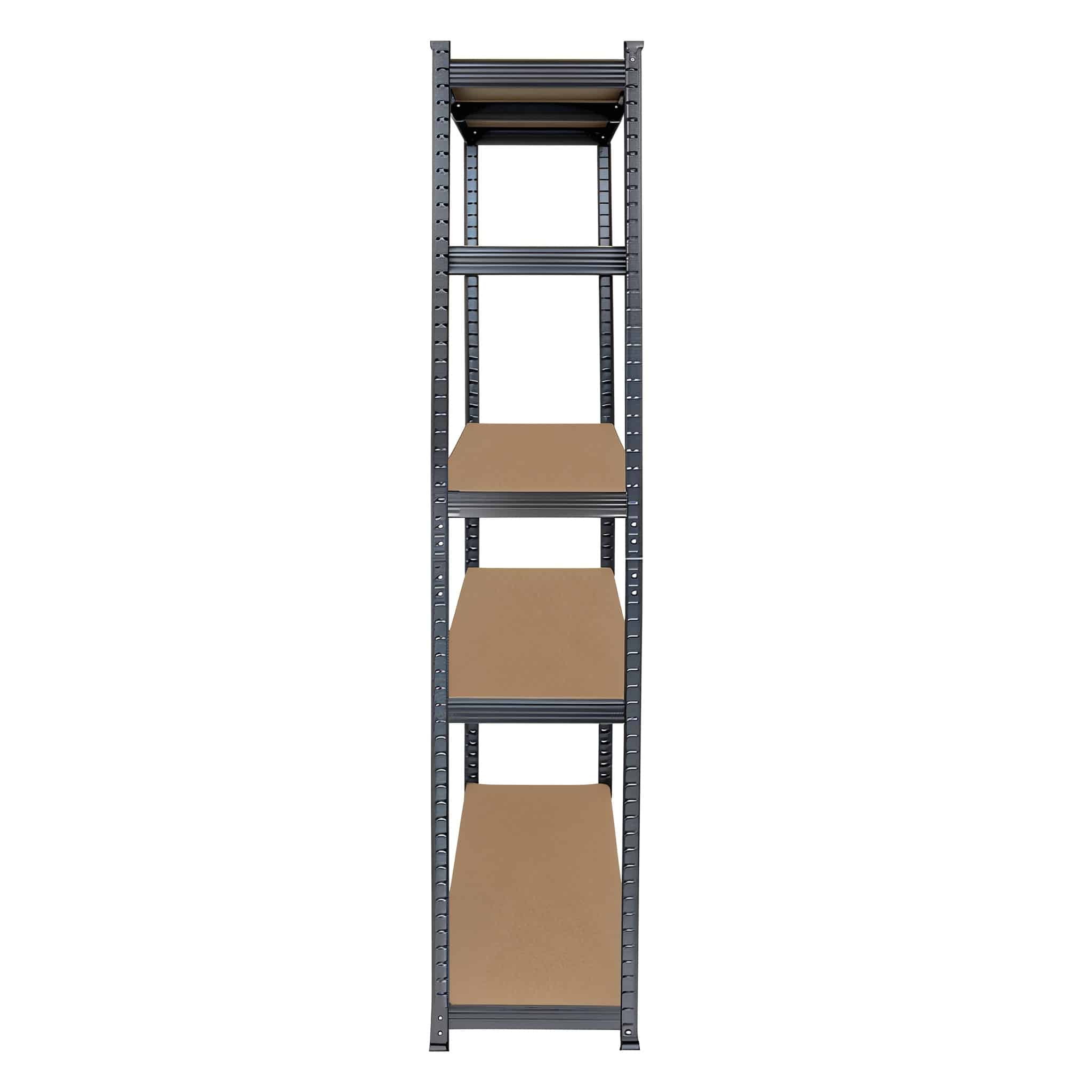 Czarny regał magazynowy o wymiarach 150x75x30 cm to praktyczne i solidne rozwiązanie do przechowywania narzędzi, zapasów czy akcesoriów w domu, warsztacie lub sklepie. Wykonany z trwałej stali malowanej proszkowo i płyt MDF, zapewnia stabilność oraz dużą nośność – aż 875 kg łącznie (175 kg na każdą półkę).