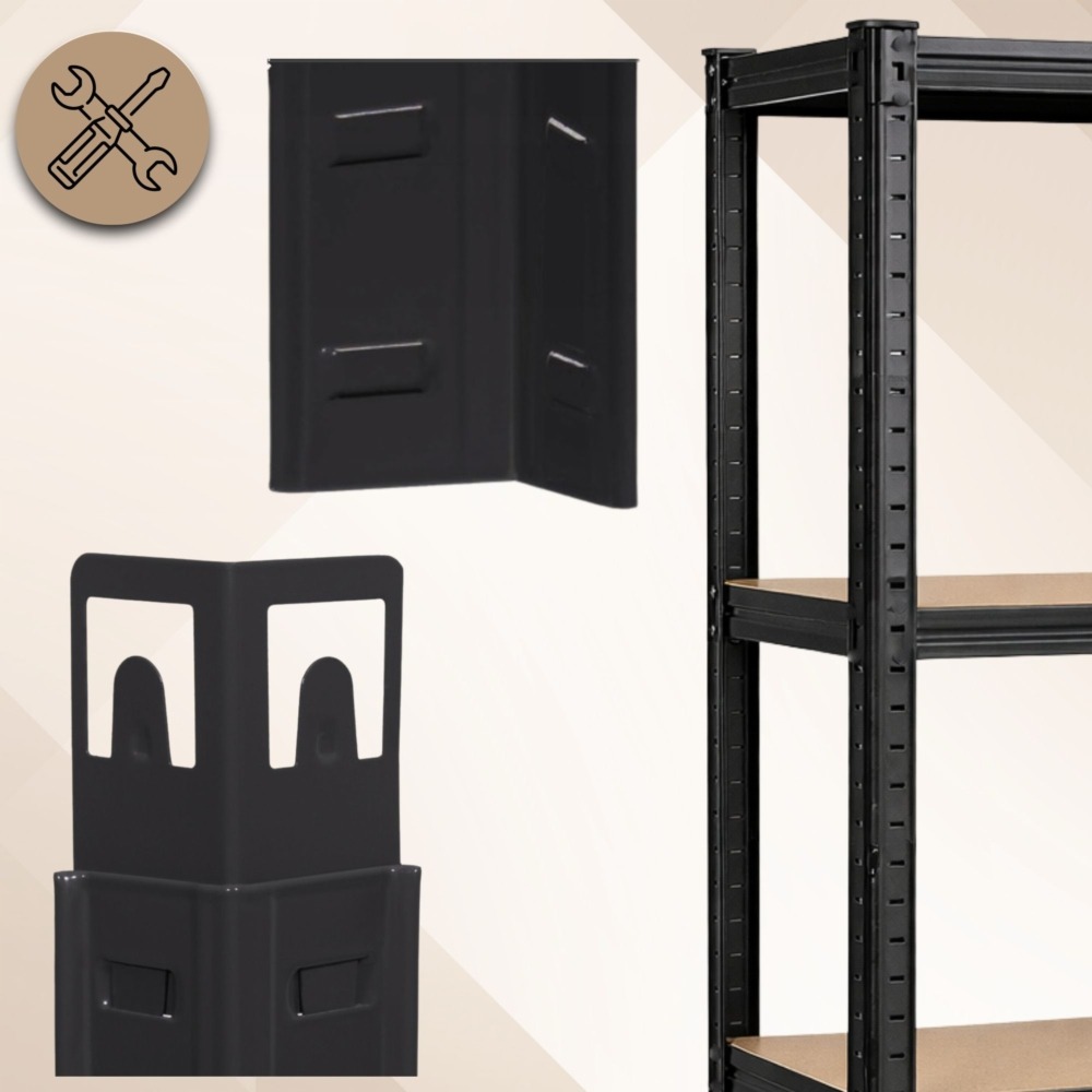 Złożenie regału nie wymaga użycia wiertarki, kluczy, śrubek ani innych skomplikowanych narzędzi, elementy łączą się ze sobą metodą na wcisk, dzięki czemu montaż jak i demontaż przebiegną szybko, bezproblemowo i bez zbędnego stresu. Ta metoda zapewnia szybką transformację regału w przypadku zmiany nagłej zmiany koncepcji lub przechowywanego asortymentu.