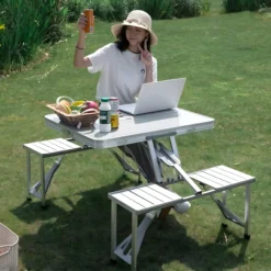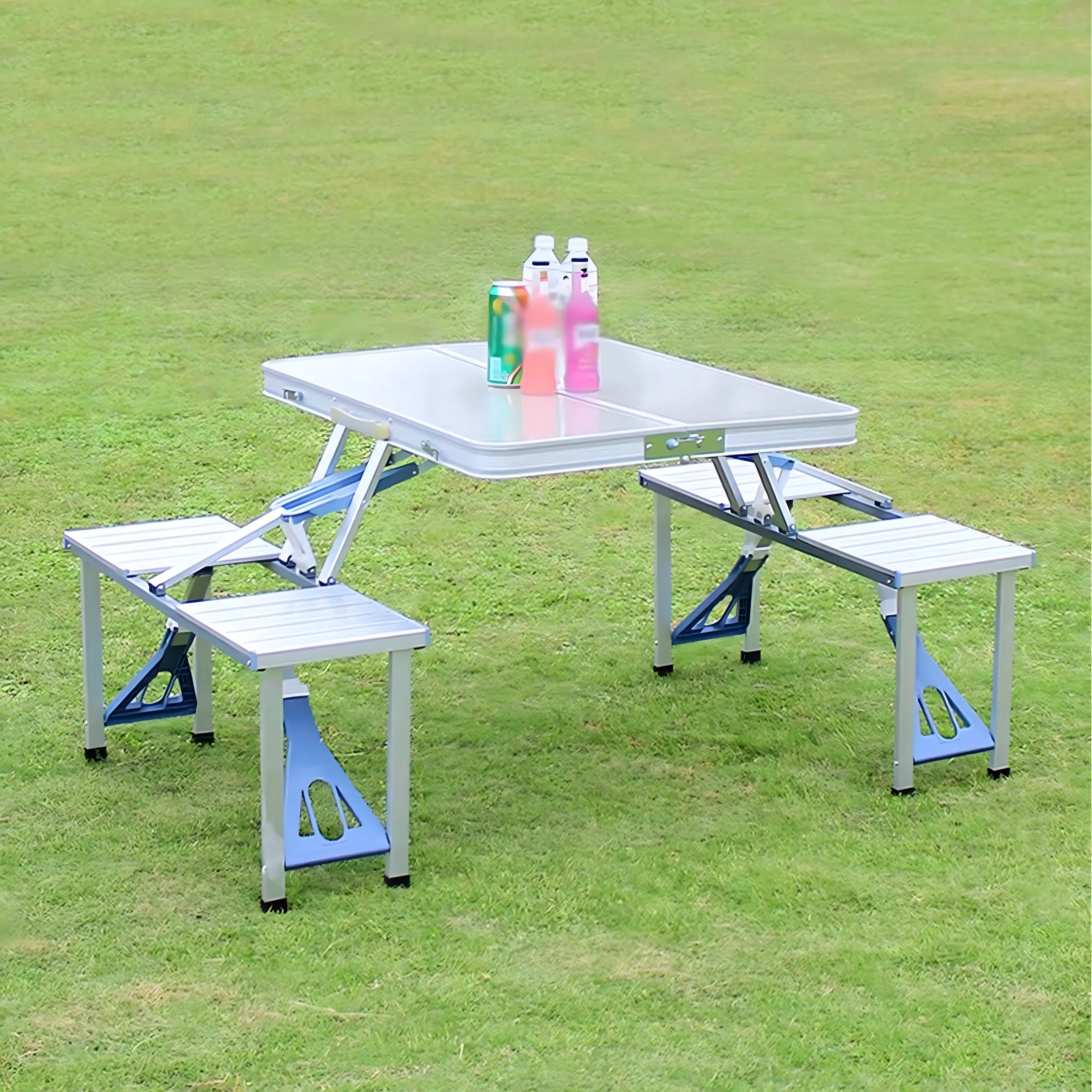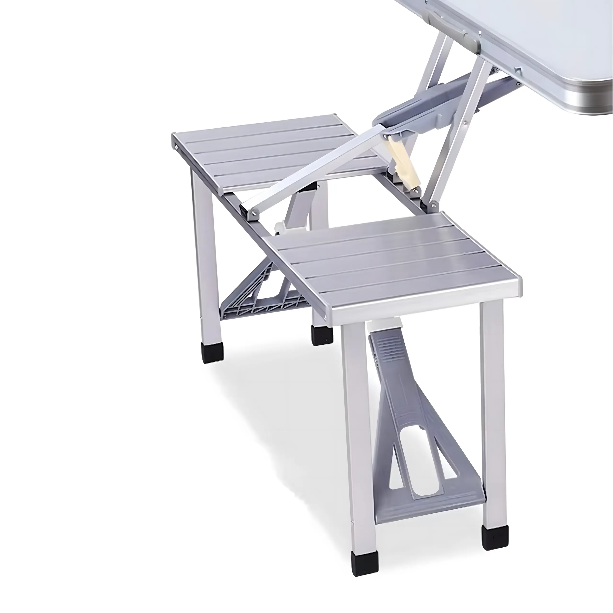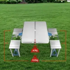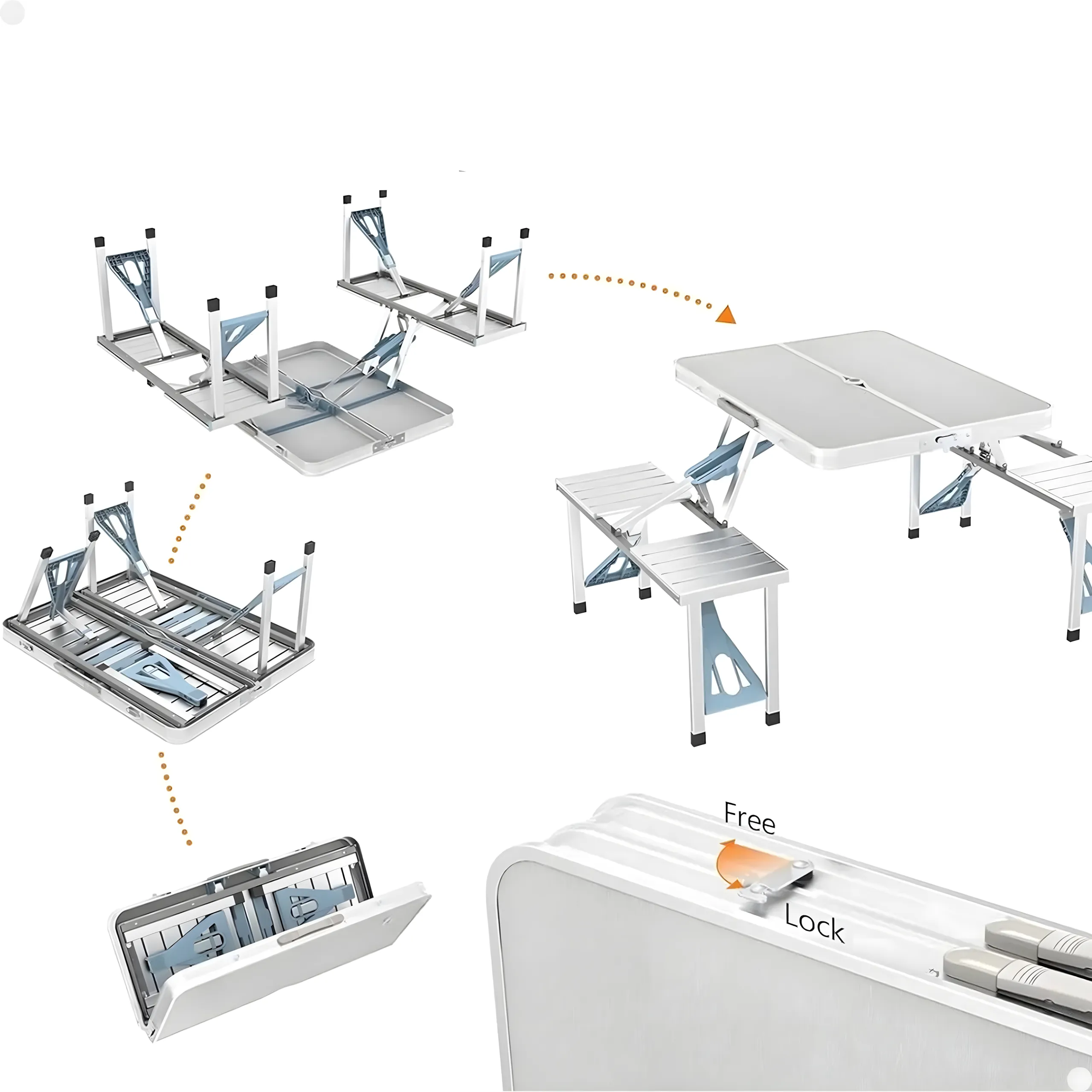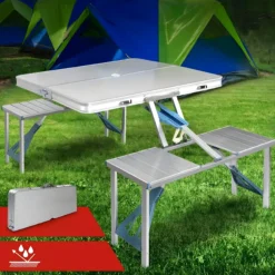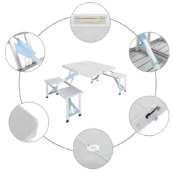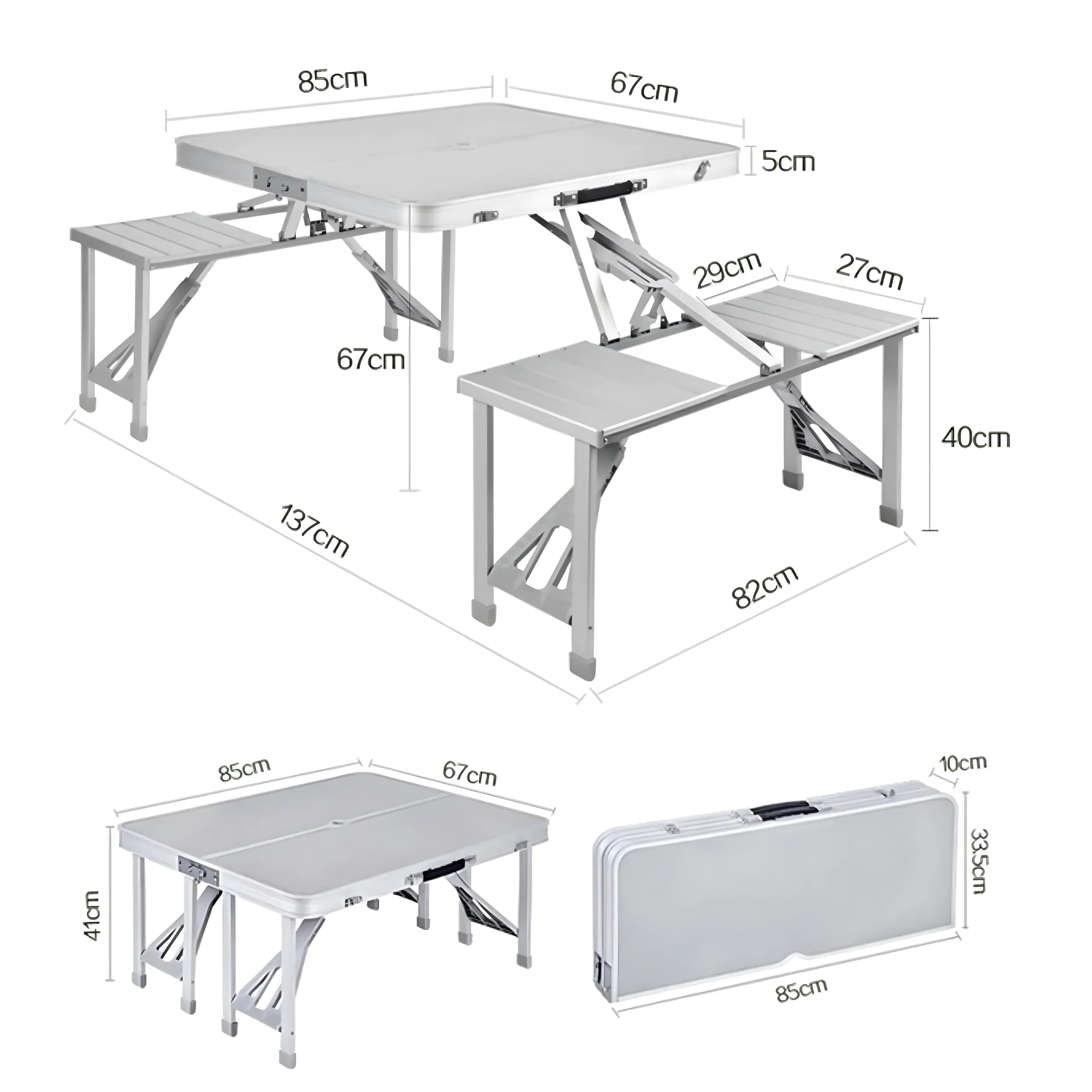 - Zintegrowany zestaw – 1 stolik + 4 składane taborety – wszystko w komplecie.