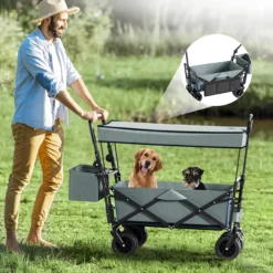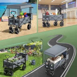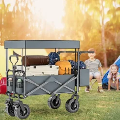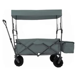 - Daszek przeciwsłoneczny – chroni zawartość wózka (lub dzieci w środku) przed intensywnym słońcem.