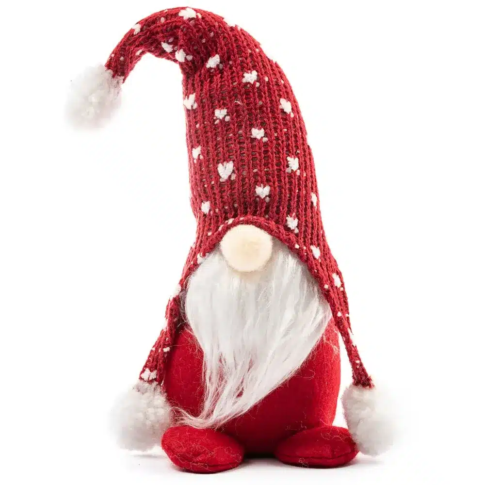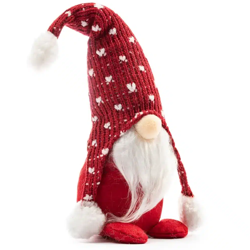 Nakrycie głowy skrzata posiada usztywnienie w postaci drutu wszytego wewnątrz, dzięki temu czapeczka nie opada i można ją dowolnie formować lub przekrzywiać według uznania. Wełniana czapeczka w czerwonym kolorze ozdobiona została 3 białymi pomponami oraz wieloma małymi serduszkami, co dodaje mu wdzięku i sprawia, że staje się wyjątkowym elementem wśród bożonarodzeniowych ozdób. Postaw na jakość i styl, wybierając tego uroczego skrzata jako część swojej świątecznej aranżacji. Duży różowy nos krasnala dodaje mu uroku i wyrazistości, odróżniając go od innych postaci, jest jedną z jego najbardziej charakterystycznych cech, która jeszcze bardziej podkreślana jego wygląd, zwłaszcza w kontekście dekoracji świątecznych.