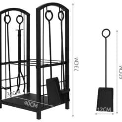 W komplecie znajdują się wszystkie elementy niezbędne do obsługi kominków i innego rodzaju palenisk; szczypce, szufelka, miotełka oraz pogrzebacz, dzięki czemu zestaw ma szerokie zastosowanie i spełni oczekiwania każdego. Pogrzebacz służy do równomiernego rozkładania palącego się drewna bądź węgla lub brykietu, a także do oczyszczania rusztu w celu lepszego przepływu powietrza. Tą samą funkcje mogą pełnić szczypce, które dodatkowo wykorzystuje się do przenoszenia palących się szczap drewna lub węgla. Jest to szczególnie istotne, kiedy wypadną z paleniska i trzeba je niezwłocznie usunąć z podłoża. Kolejne elementy to szufelka oraz miotełka, które są niezbędne do dokładnego oczyszczenia płyty paleniskowej. Pomagają usunąć nie tylko popiół, ale ewentualnie niedopalone resztki. Akcesoria posiadają specjalne uchwyty za które powiesimy je na haczykach znajdujących się na stojaku.