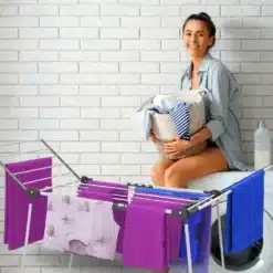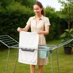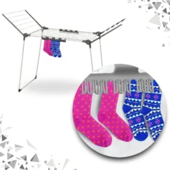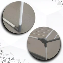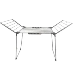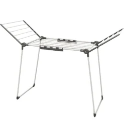 Funkcjonalna i wytrzymała wolnostojąca suszarka na pranie w kolorze biało-szarym, która stanie się nieodzowną częścią każdego gospodarstwa domowego. Idealna do użycia zarówno wewnątrz, jak i na zewnątrz, jej stabilna konstrukcja gwarantuje bezpieczeństwo suszenia dużej ilości odzieży za każdym razem, grube, mocne pręty są przystosowane do ciężaru ubrań, pościeli czy ręczników. Dwa rozkładane ramiona zapewniają dużą przestrzeń suszenia, a mniejsze rzeczy, takie jak skarpetki lub niemowlęce ubranka można powiesić na dodatkowych wieszaczkach, które skutecznie zabezpieczą je przed pochwyceniem przez wiatr.