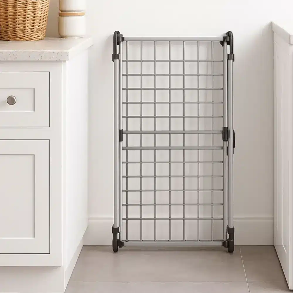 Jednopoziomową suszarkę wolnostojącą można złożyć i wtedy suszarka praktycznie nie zajmuje miejsca. Dzięki takiemu rozwiązaniu można prawie, że zapomnieć o nieużywanej suszarce i przechowywać ją w bardzo wąskich przestrzeniach, takich jak w szafa, mały kąt łazienki czy w przedpokoju.
