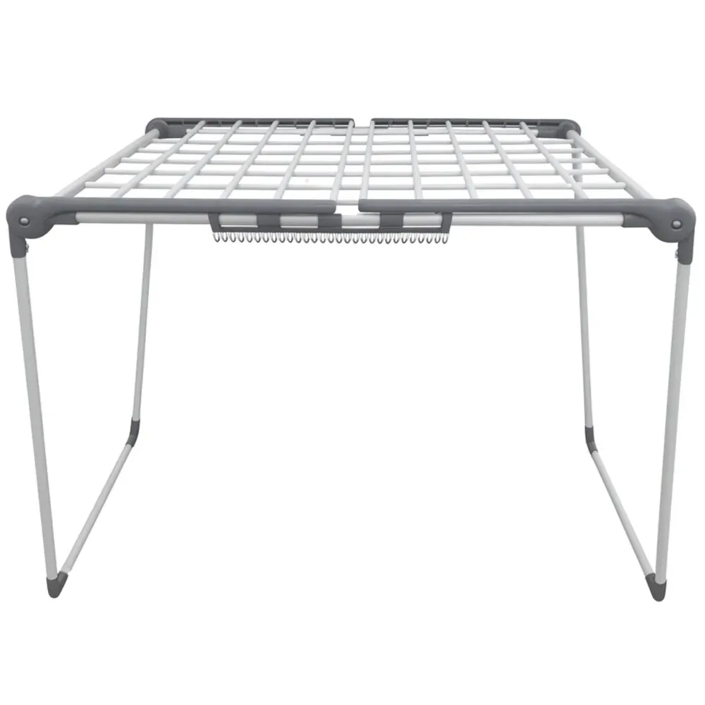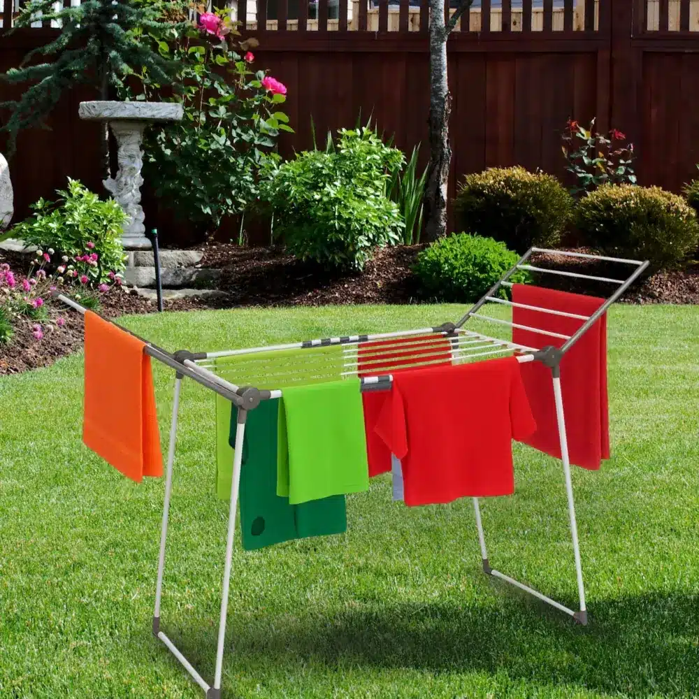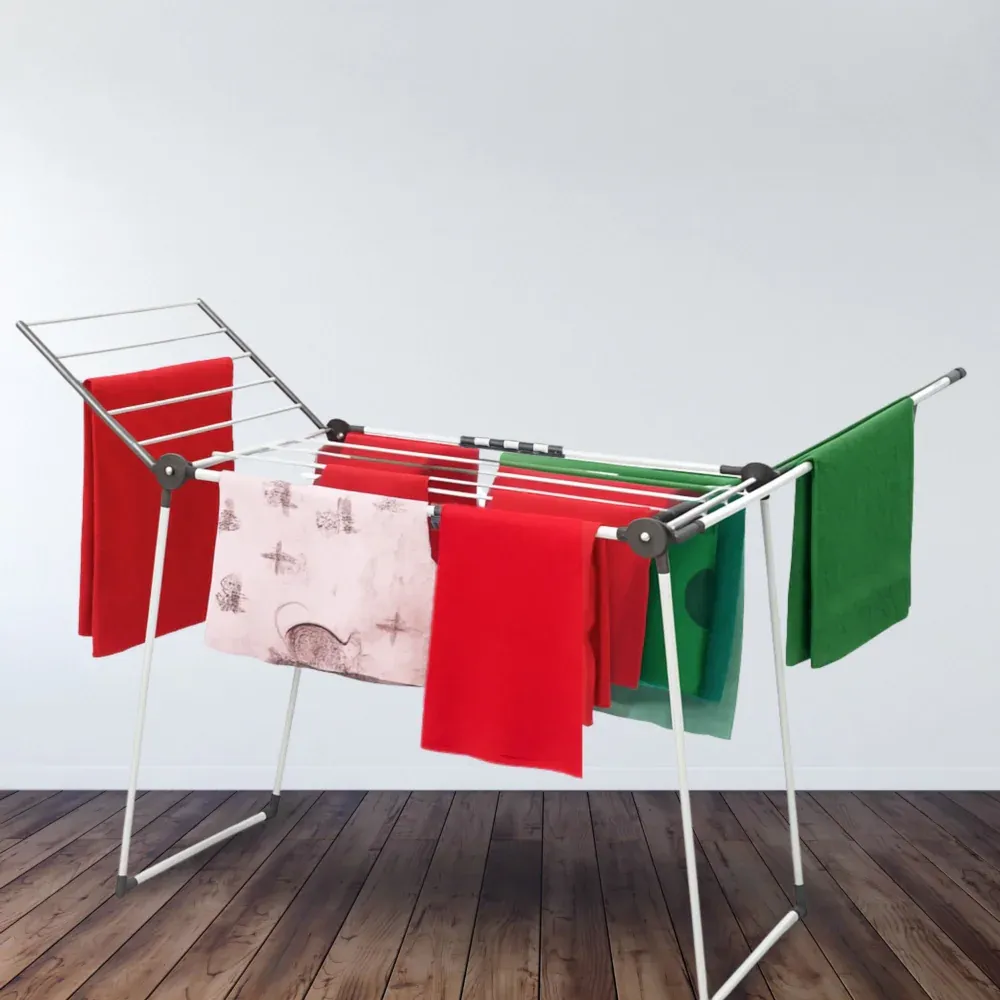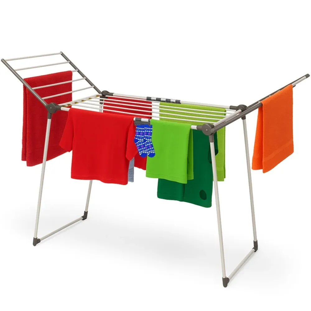 Funkcjonalna i wytrzymała wolnostojąca suszarka na pranie w kolorze biało-szarym, która stanie się nieodzowną częścią każdego gospodarstwa domowego. Idealna do użycia zarówno wewnątrz, jak i na zewnątrz, jej stabilna konstrukcja gwarantuje bezpieczeństwo suszenia dużej ilości odzieży za każdym razem, grube, mocne pręty są przystosowane do ciężaru ubrań, pościeli czy ręczników. Dwa rozkładane ramiona zapewniają dużą przestrzeń suszenia, a mniejsze rzeczy, takie jak skarpetki lub niemowlęce ubranka można powiesić na dodatkowych wieszaczkach, które skutecznie zabezpieczą je przed pochwyceniem przez wiatr.
