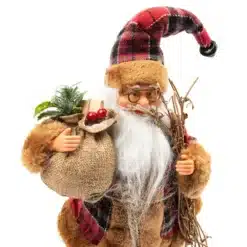 Wełniana czapka Mikołaja została wykończona puszystym futerkiem, a na jej czubku znajduje się uroczy dzwoneczek, pobrzękujący przy każdym ruchu. W jednym ręku trzyma chrust na ognisko, a w drugim worek wypełniony igliwiem i prezentami, co stanowi idealne dopełnienie mieszkań stawiających na naturalne, pachnące lasem aranżacje. Oczywiście najbardziej charakterystycznym elementem Mikołaja są druciane okulary na nosie i długa siwa broda. Czarne plastikowe buty zapewniają stabilność i sprawiają, że figurka nie ruszy się nigdzie z przypisanego jej miejsca.