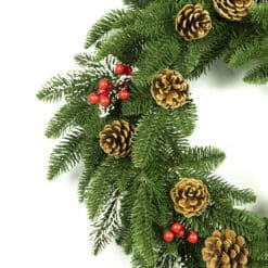 - Materiał: jodła PE, naturalna szyszka, jarzębina, śnieżone gałązki PE