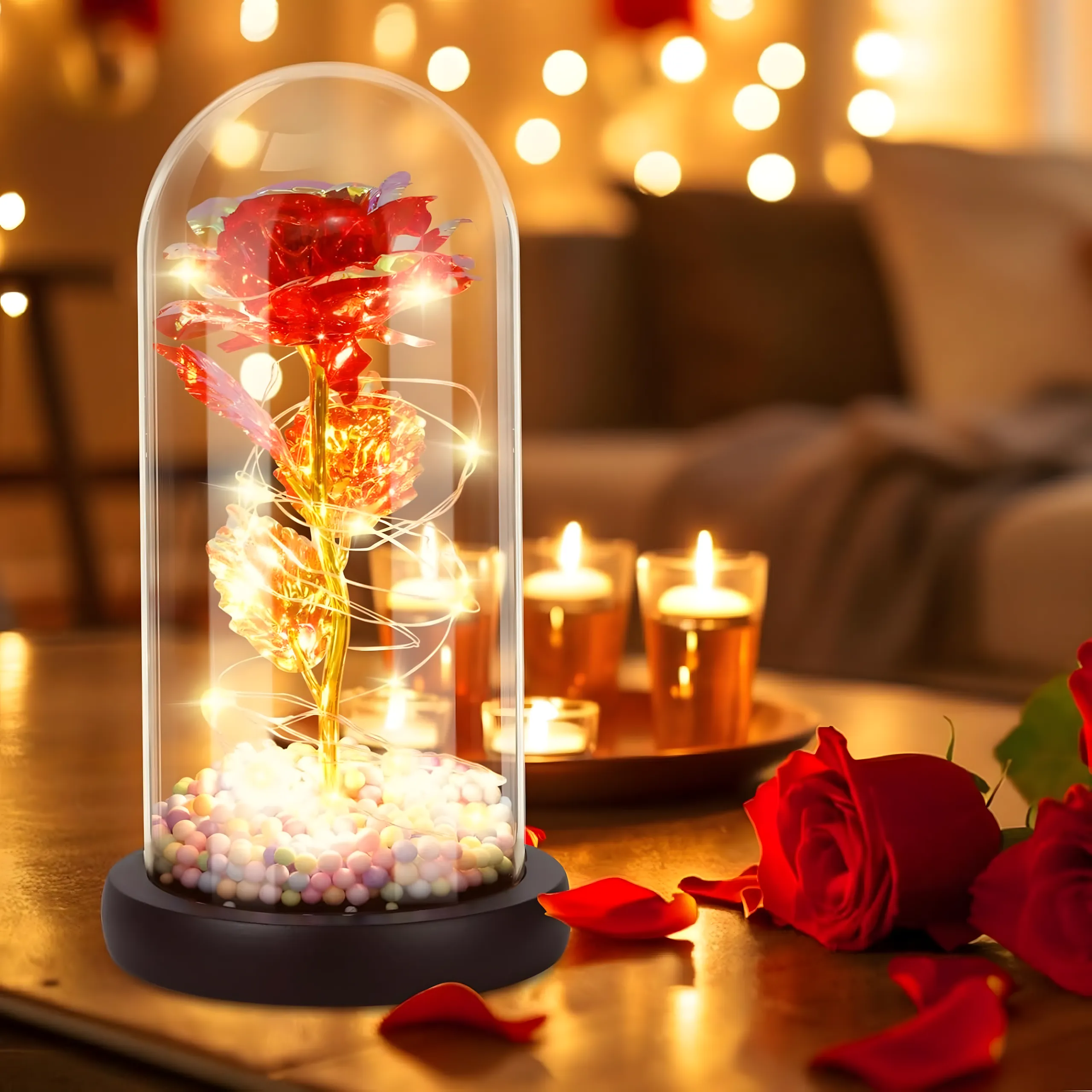 Zabezpiecza kwiat róży przed uszkodzeniem oraz osadzającym się kurzem. Jej specjalna budowa rozprasza światło LED nadając niezwykłego klimatu, przywołując czar wspomnień. Dzięki niej będzie można przeżyć wyjątkowe chwile na nowo, wracając wspomnieniami do ukochanej osoby.