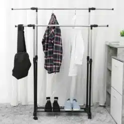 Na wieszak składają się dwie rurki do zawieszania ubrań. Pozwala to na zawieszenie dwa razy większej ilości ubrań czy zwiększeniu powierzchni stojaka o tylko 25%.