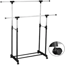 Na wieszak składają się dwie rurki do zawieszania ubrań. Pozwala to na zawieszenie dwa razy większej ilości ubrań czy zwiększeniu powierzchni stojaka o tylko 25%.