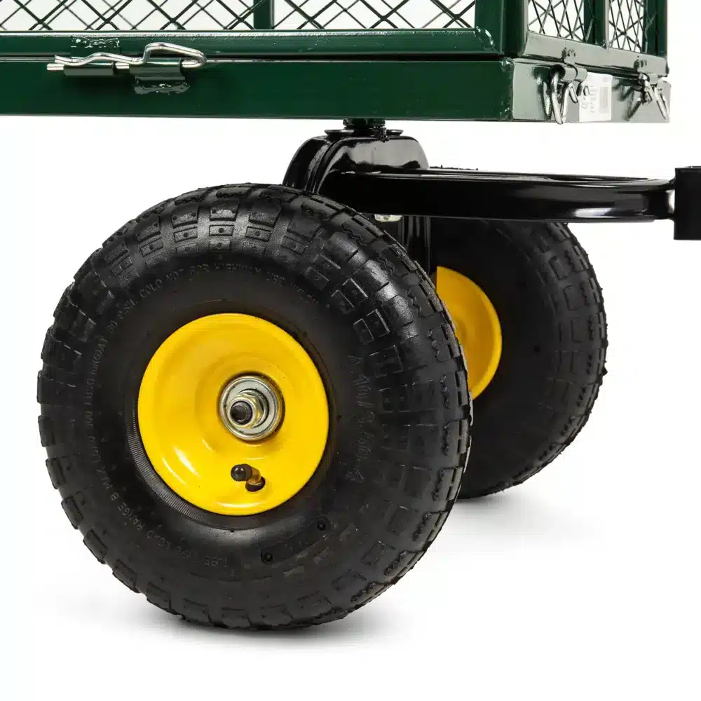 Prowadzenie wózka nawet przy dużym obciążeniu jest dziecinnie proste. Cztery duże pompowane koła, z bieżnikowaną oponą, sprawiają, że wózek porusza się płynnie nawet po największych wertepach i nierównościach, a tych jak wiadomo nie brakuje na działce czy w ogrodzie. Maksymalny zakres skrętu przedniej osi to aż 180°, dzięki czemu wózek prowadzi się lekko i łatwiej nim jest manewrować, nawet przy dużym obciążeniu skrzyni ładunkowej. Wygodna rączka dyszla pokryta została antypoślizgową pianką, dzięki czemu pewnie trzyma się w dłoni.
