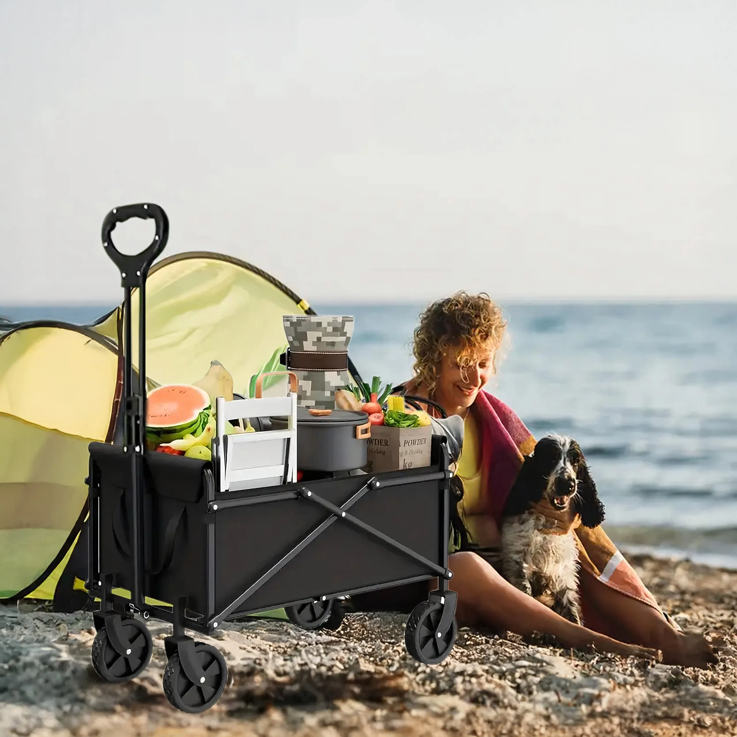 Wózek posiada wytrzymały stelaż, mocną tkaninę odporną na przetarcia oraz duże koła, które ułatwiają poruszanie się po piasku, trawie i nierównym terenie. Składana konstrukcja pozwala szybko złożyć wózek do kompaktowych rozmiarów, dzięki czemu łatwo go przechowywać i przewozić w bagażniku.