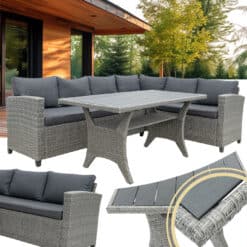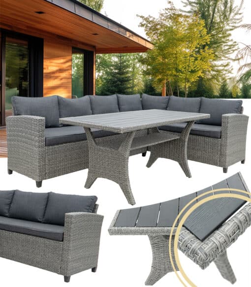Ten elegancki zestaw mebli ogrodowych z technorattanu przeznaczony jest dla sześciu osób, co czyni go idealnym wyborem na rodzinne obiady, letnie grillowanie czy spotkania z przyjaciółmi. Dzięki swojej funkcjonalności i nowoczesnemu designowi wpasuje się zarówno w przydomowy ogród, jak i na taras.